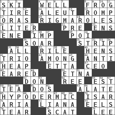 ACROSS 1. What Jean-Claude Killy likes to do 4. Water source 8. Toadlike animal 12. Hoop that covers a wheel 14. Eskimo relative 16. Play 17. Mouths or openings 18. Complicated, petty procedures 20. 61 cubic inches 22. Before (prefix) 23. Followers of ems 24. Compass dir. 25. Mischievous child 28. Luau course 30. Fly high 31. Long narrow piece of something 35. Everything 37. Cause heat under the collar 40. Coop moms 41. Musical group of three 42. Amid 44. Against 45. Pile 46. Singer James 47. Corporate head (abbr.) 48. Having ears or earlike features 50. Inactive volcano in Sicily 52. Spanish title 54. To sift 55. Eastern Standard Time (abbr.) 58. Beverage made from leaves 61. Two (Sp.) 63. Having winglike extensions 65. Subcutaneous 70. Austrian river, tributary to the Danube 71. Operatic vocal solo 72. Woody, climbing, usually tropical plant 73. Snakelike fish 74. Rend 75. Jazz singing style 76. Area sheltered from the wind DOWN 1. Took without asking 2. Japanese brewing company 3. Feeling or showing extreme anger 4. Armed conflict 5. Connecticut Ivy Leaguer 6. Part of a journey 7. Mass 8. Away 9. Hero or heavy, e.g. 10. Sign of things to come 11. Global Positioning Systems (abbr.) 13. Compass dir. 15. Canvas cover 19. Vintage cars 21. River (Sp.) 26. Hindu Mythology: god of death 27. First class 29. New York city 30. Slanted 32. French philosopher Descartes 33. To the inside or interior of 34. Air pressure measure (abbr.) 35. Type of rug 36. One who doesn't tell the truth 38. Car dealer's back yard 39. Keyboard key 41. Definite Article 43. Yard entry 49. Texas town _ City 51. Teachers' org. 53. Christmas carol 55. Artist's stand 56. Lacking originality or spontaneity 57. Laconic 58. Not this but _ 59. Jane of fiction 60. Capital of Western Samoa 62. Indian titles of respect 64. Whopper 66. Boat paddle 67. Big _ 68. _ tizzy (2 wds.) 69. Domesticated feline