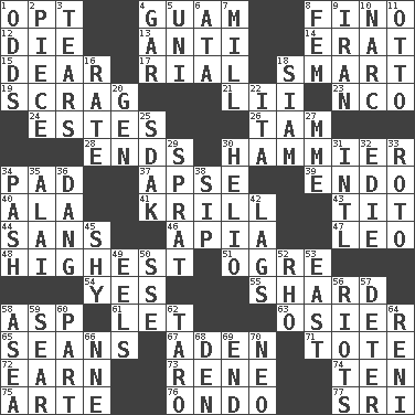 ACROSS 1. Choose 4. Island territory of the United States 8. A pale, very dry sherry 12. Expire 13. Against 14. Part of Q.E.F. 15. Letter starter 17. Monetary unit of Yemen 18. Don Adams' spy role 19. Strangle with an iron collar 21. Cards in a Roman deck? 23. Non-commissioned officer (abbr.) 24. _____ Park, CO 26. Scottish cap 28. Conclusions 30. More given to overacting 34. Writing tablet 37. Domed church section 39. Inside; within (prefix) 40. According to 41. Shrimp-like planktonic crustaceans 43. Teat (slang) 44. Without 46. Capital of Western Samoa 47. Lion 48. Having the greatest elevation 51. Legendary monster 54. Consenting reply 55. Pottery fragment 58. Viper 61. Allow 63. Flexible twig of a willow tree 65. Actors Connery and Penn 67. Arabian gulf 71. Carryall 72. Merit 73. French philosopher Descartes 74. "___ Little Indians" 75. Johnson of "Laugh-In" 76. Southwest Nigerian state 77. _ Lanka DOWN 1. Likelihood 2. Component 3. Rends 4. Slender fish 5. University (slang) 6. _ moment's notice (2 wds.) 7. Place where flour is made 8. Opposite of masc. 9. SW Asia republic 10. Drug cop 11. "Beetle Bailey" pooch 16. Pace 18. Thailand, formerly 20. Commissioned mil. rank 22. Call ___ day 25. Neighbor of Neb. 27. Madame (abbr.) 29. Small fatty European fish 30. Sun: prefix 31. International (abbr.) 32. Singer Brickell 33. Printing process, for short 34. Romantic infatuation 35. Jai ____ 36. Mild oath, euphamism for damn 38. Small drink 42. Fails to keep up a pace 45. Like a shrinking violet 49. Snakelike fish 50. Compass dir. 52. 17th letter of the Greek alphabet 53. 90 degrees 56. Disturbances 57. Prevent from occurring 58. At sea 59. Shrivel 60. Component 62. Edible starchy tuberous root 64. Painter Guido (1575-1642) 66. Compass dir. 68. Lair 69. Conclusion 70. Modern: prefix