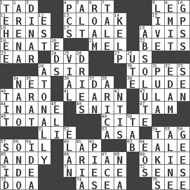 ACROSS 1. Small amount or degree 4. Piece 8. Part of a journey 11. 4th largest of the Great Lakes 13. Loose outer garment 15. Naughty child 16. Coop moms 17. Lacking originality or spontaneity 18. Deliberation 19. Maternal 21. Cartoonist voice _ Blanc 22. Stakes 23. Hearing organ 24. Movie disc 27. Festering 29. SW Saudi Arabia district 30. Drinks excessively 34. Fish or hair follower 36. Opera by Verdi 39. Dodge 40. Edible starchy tuberous root 41. Acquire or gain knowledge or skills 43. Uhlan (variant) 44. Lacking in sense or substance 46. In a ____ (agitated or irritated) 47. Scottish cap 48. "_____ Recall" 49. Quote 51. Falsehood 53. White ___ sheet 54. Label 57. The visible part of the earth's surface 60. Pet locale 63. Memphis, Tenn. Street 65. "60 Minutes" Commentator Rooney 66. Believer in; advocate of (suffix) 69. Migrant worker of the '30s 70. Binary compound 71. Sibling's daughter 72. Elected reps. 73. ___ good deed 74. At sea 75. Observe DOWN 1. Giggle 2. Sports stadium 3. Middle Eastern gold or silver currency 4. Personal Computers (abbr.) 5. The first octave above the treble staff 6. Wander 7. Lie 8. Moving, as bait 9. Give off 10. Global Positioning Systems (abbr.) 12. Eastern Standard Time (abbr.) 14. Seaweed 18. Utter; complete 20. Begley and Asner 25. Small bottle 26. Frees from moisture 28. Shoshoni 29. Lacking a tonal center or key 31. Monetary unit of Botswana 32. Dutch treat 33. Elected rep. 34. Billionth: prefix 35. Part of Q.E.F. 37. One of the 12 tribes of Israel 38. N. Chile seaport 40. Teat (slang) 42. Nuclear Threat Initiatives 45. Biblical high priest 50. Bar bill 52. Flair 54. Proceeds 55. Place in a line 56. Honkers 57. Stated 58. Southwest Nigerian state 59. The content of cognition 61. Roberta Peters solo 62. Sliced desserts 64. Greek goddess of the dawn 67. Adept person 68. Teachers' org.