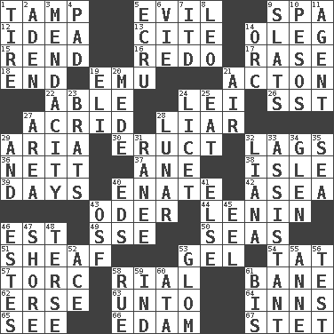 ACROSS 1. Pack (down) 5. Tending to cause great harm 9. Health resort 12. It may be bright or harebrained 13. Quote 14. Cassini of fashion 15. Tear apart 16. Redecorate 17. To erase 18. Conclude 19. Australian flightless bird 21. Gambison 22. Competent 24. Flowery wreath 26. Fast jet (abbr.) 27. Sour-tasting 28. One who doesn't tell the truth 29. Roberta Peters solo 30. Spew [out] 32. Falls behind 36. Remaining after all deductions 37. A saturated hydrocarbon 38. Small island 39. 24-hour periods 40. Maternal 42. Toward the sea 43. Baltic tributary 44. Soviet premier 1918-24 46. Eastern Standard Time (abbr.) 49. Compass dir. 50. Oceans 51. Archer's quiver 53. Set 54. Make lace 57. Torque (variant) 58. Monetary unit of Yemen 61. Object of repulsion 62. Celtic language 63. To (old English) 64. Restaurants 65. Observe 66. Dutch treat 67. Proofreading order DOWN 1. Become fatigued 2. An important port of Yemen 3. Ananias' fault 4. Groovy apt. 5. Shade of tan 6. Compete 7. It would 8. Lion 9. Narrow boards 10. Mexican monetary units 11. Representative 14. The grampus (Milton) 19. Biblical high priest 20. Ancient Persian 21. Atmosphere 23. Naughty children 24. It is permitted: Lat. 25. Ingest 27. Length times width 28. Type of eclipse 29. Added to 31. The wife of a rajah (variant) 32. Woody, climbing, usually tropical plant 33. Aide 34. Small, secluded valley 35. Ocean 40. Begley and Asner 41. Otherwise 43. Order of Saint Francis (abbr.) 45. Snakelike fish 46. _____ Park, CO 47. Dinah or Pauly 48. Laconic 52. Adept person 53. Take by theft 55. Queen of England 1702-14 56. Trial 58. Regret 59. Indiana (abbr.) 60. "One Day ___ Time" 61. Twice