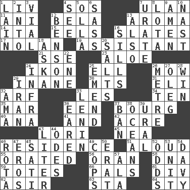 ACROSS 1. 54 in ancient Rome 4. Mayday 7. ____ Bator 11. Black tropical American cuckoo 12. Actor Lugosi 13. Scent 14. Call ___ day 15. Snakelike fish 16. Chalkboards 17. Pitcher Ryan 19. Helper 21. Compass dir. 23. _ vera 24. Picture 25. Pipe bend 26. Cut the grass 29. Lacking in sense or substance 30. Mountains (abbr.) 31. Connecticut Ivy Leaguer 32. Sandy's bark 33. French article 34. "___ Little Indians" 35. Impair 36. Car or cant ending 37. Town 40. Santa ___, CA 41. Plus 42. 1/640 square mile 43. Australian parrot (variant) 45. Teachers' org. 46. Dwelling 51. Verbally 55. Declaimed 56. NW Algerian seaport 58. Heredity factor (abbr.) 59. Lugs 60. Friends 61. HTML Container Element 62. SW Saudi Arabia district 63. R.R. building 64. Filthy place DOWN 1. (Had) reclined 2. To the inside or interior of 3. Small bottle 4. Observe 5. Spanish pot 6. Backtalk 7. A salt of uric acid 8. Globular water bottle used in Asia 9. So be it 10. Political cartoonist Thomas 12. Gillaume's butler role 13. In addition 16. Beverly of Met fame 18. "____ silly question..." 20. Table seasonings 22. Compass dir. 24. Kind of red light 25. Make improvements or corrections to 26. Distance measurement (Brit.) 27. Cassini of fashion 28. Victory 29. SW Asia republic 32. Nanny (var.) 33. Soviet premier 1918-24 36. Having ears or earlike features 37. Forbid 38. Seas 39. Mountain range 43. 61 cubic inches 44. Lyric poems 46. Roll call or roster of names 47. Greek god of love 48. Suttee (variant) 49. 911 reaches them 50. Part of Q.E.F. 52. Probability 53. A single undivided whole 54. American folk hero Crockett 57. In the manner of