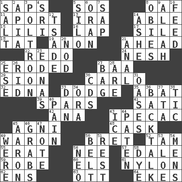 ACROSS 1. Plant excrements 5. Distress signal 8. Clumsy lout 11. To the left, to Queeg 13. Lyricist Gershwin 14. Competent 15. Ms. Damita and namesakes 16. Pet locale 17. Filth; sediment 18. Make lace 19. Soon (poet.) 21. Having the leading position 22. Make new 24. Tender 25. Eaten away 27. Sound made by sheep 29. The Jewish people; Israel 30. Monte _, Las Vegas Hotel/Casino 32. Pulitzer Prize-winning author Ferber 33. Evade 35. Blind as ____ 39. Practice fights 41. Suttee (variant) 42. Santa ___, CA 43. Medicinal drug used to evoke vomiting 45. Hindu god of fire 48. Keg 49. Make _____ (do battle with) 50. Cy Young winner Saberhagen 52. Scottish cap 55. Part of Q.E.F. 56. Born 57. Peak District village in England 59. Loose flowing garment 60. Raised railways 61. Thermoplastic polyamide 62. Followers of ems 63. Baseball player Mel 64. Supplements with great effort DOWN 1. Table seasoning 2. Capital of Western Samoa 3. Characterized by complete cowardliness 4. Indian title of respect (Mr.) 5. Grain storage tower 6. NW Algerian seaport 7. Plant excrement 8. Off-Broadway awards 9. Assad's deity 10. Nourish 12. Sadhe (variant) 14. American tennis player Robert 20. Allow head to fall sleepily 21. Of or related to the anus 23. Ferber et al. 25. Compass dir. 26. To free from 27. Container for groceries 28. "We ___ not amused" (Victoria) 30. Music discs 31. Fertile tracts in a desert 33. One of the 12 tribes of Israel 34. Mouth or opening 36. Sass 37. "One Day ___ Time" 38. Nervous spasm 40. Ache 43. Frozen water 44. Eucharist need 45. Composer Copland 46. Catches 47. Make mention of 49. We are 50. Waist strap 51. Take ten 53. _ vera 54. Not women's 56. Modern: prefix 58. Color