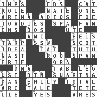 ACROSS 1. Naughty children 5. Begley and Asner 8. Domesticated feline 11. Hero or heavy, e.g. 12. Nathan's nickname 14. Single 15. Sports stadium 17. Goodbye (Sp.) 18. Enemy 19. Sycophants 21. Health resort 22. Avid follower 23. Followers of ems 24. Two (Sp.) 25. Shoshoni 27. Black tropical American cuckoo 28. Snakelike fish 31. Canvas cover 35. Compass dir. 37. Highlander 38. The main thing one is thinking about 39. Make lace 41. Ballerina skirt 42. Political cartoonist Thomas 43. Friend of Pooh 45. Connect, as a bridge 46. 4th largest of the Great Lakes 47. Mouth or opening 49. Heredity factor (abbr.) 51. Keyboard key 52. Lion 55. Purpose 57. Storage container 60. Catching in a trap 62. One of the 12 tribes of Israel 63. Poet Dickinson 65. Add up to 66. Curve 67. Story 68. Wig 69. Untruth 70. Consenting reply 71. Ancient Greek god of war DOWN 1. Feeling or showing extreme anger 2. Person of subnormal intelligence 3. Entreaties 4. Post 5. Conclusion 6. Raised platform 7. Constrict 8. Java holder (2 wds.) 9. Small Philippine buffalo 10. Adolescent 13. He sold his birthright 16. Opera by Verdi 17. Help 20. Immeasurably long periods of time 26. Trials 29. Globular water bottle used in Asia 30. Surprise greatly 31. Prong on a fork 32. The sixth month of the Jewish calendar 33. Dwelling 34. Eucharist need 36. Armed conflict 40. Tootsie (variant) 44. Northwest Algerian city 48. Blind as ____ 50. Collude with 52. 61 cubic inches 53. Maternal 54. Stares at amorously 55. Hereditary estate 56. Indian skirt 58. "If ____ say so..." 59. "Death on the ____" 61. Roll call or roster of names 64. French article