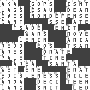ACROSS 1. Alias (abbr.) 4. Republicans 8. Is not 12. Straggles 14. He sold his birthright 15. Letter starter 16. Nights before holidays 17. Unrelated to defense, as in spending 20. Patter 21. Compass dir. 22. Had dinner 23. Sadhe (variant) 27. Give off 29. Armed conflicts 31. Be footloose 34. Soviet premier 1918-24 35. Roberta Peters solo 36. Do over again 39. Greek goddess of the dawn 41. Russian ruler of old 42. Ancient Greek god of war 43. Speak pompously 46. Diluted with white 47. Prong on a fork 48. Length times width 51. Before Barbara or Clara 54. Soggy 56. Compass dir. 58. Part of Q.E.F. 61. The property of being fit to eat 66. Mediterranean tributary 67. Small Philippine buffalo 68. Tenth: prefix 69. Adolescent 70. Austrian-born American filmmaker Fritz 71. In a ____ (agitated or irritated) 72. Directed DOWN 1. Actor Baldwin 2. Polynesian shrub of the pepper family 3. Rep 4. Commissioned military rank (abbr.) 5. Bear (Spanish) 6. Baking dish 7. Soap bubbles 8. Binary compound 9. Elected representatives 10. Political cartoonist Thomas 11. Relationship diagram 13. Fast planes 18. Compass dir. 19. Opposite of masc. 24. Deep reverence 25. Daniel's nick name 26. One of the Great Lakes 28. Feeling or showing extreme anger 30. Snob 32. By way of 33. Ewer handle 34. Failure 36. Hit sharply and swiftly 37. Period 38. Accusation by an informer 40. Indian titles of respect 44. Santa ___, CA 45. Nine, plus one 49. Snakelike fish 50. One (Scot) 52. Portable shelter 53. Satellite of Uranus 54. Welt 55. Pulitzer Prize-winning author Ferber 57. Conclusions 59. Toward shelter 60. Watch over 62. Container for groceries 63. Car or cant ending 64. _-fi 65. Be seated