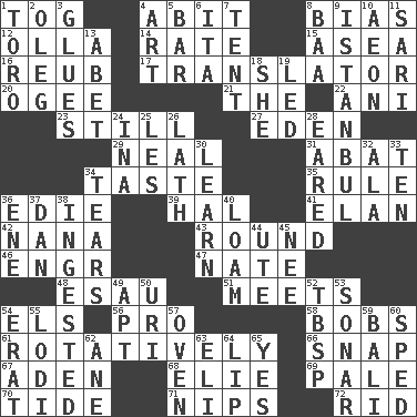 ACROSS 1. Coat; cloak 4. "This won't hurt ____!" 8. Prejudice 12. Water jar 14. Assign a rank or rating to 15. Toward the sea 16. Reuben's nickname 17. Interpreter 20. Double curve, resembling the letter S 21. Definite Article 22. Cuckoo 23. Not moving 27. Paradise 29. Actress Patricia 31. Blind as ____ 34. Clothes sense 35. Court order 36. Singer Brickell 39. Actor Linden 41. Style 42. Grandmother 43. One shot 46. Engineer (abbr.) 47. Nathan's nickname 48. He sold his birthright 51. Confronts 54. Raised railways 56. Adept person 58. Moves up and down 61. Rotating or pertaining to rotation 66. Fastener 67. An important port of Yemen 68. Writer Wiesel 69. Diluted with white 70. Periodic rise and fall of the sea level 71. Pinches, bites 72. To free from DOWN 1. "Corrida" creature 2. Cassini of fashion 3. Cements 4. Tate display 5. Soap unit 6. Call ___ day 7. Portable shelter 8. Sound made by sheep 9. Byzantium, centuries later 10. Period of immesurable duration 11. Indian skirt 13. Collude with 18. A female animal or person 19. Directed 24. _ tizzy (2 wds.) 25. French article 26. Thin strip of wood or metal 28. Having ears or earlike features 30. Memorize 32. Wing 33. "___ Little Indians" 34. Rends 36. Compass dir. 37. One of the 12 tribes of Israel 38. Consumed 40. Rich soil 44. Shoshoni 45. Born 49. Fitting 50. RI univ. 52. Cook's measure (abbr.) 53. Underwater navigation system 54. Part of Q.E.F. 55. Farming town in central California 57. Baking chamber 59. Indonesian resort city 60. Moved rapidly 62. A saturated hydrocarbon 63. Connecticut Ivy Leaguer 64. Mouth edge 65. Consenting reply
