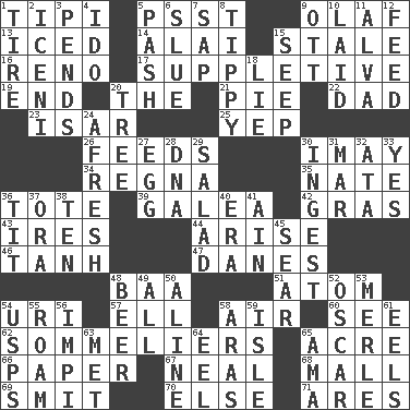 ACROSS 1. Native american tent (variation) 5. Inconspicuous attention getter 9. Norwegian king 13. On the rocks 14. Jai _ 15. Lacking originality or spontaneity 16. Former U.S. Attorney General Janet 17. Supplying deficiencies 19. Conclusion 20. Definite Article 21. Sliced dessert 22. Male parent 23. Austrian river, tributary to the Danube 25. Slangy assent 26. Eats 30. "If ____ say so..." 34. Canadian anthropologist Darnell 35. Nathan's nickname 36. Carryall 39. An organ shaped like a helmet 42. Pate de foie ____ 43. Angers 44. Get up 46. Hyperbolic tangent 47. Natives or inhabitants of Denmark 48. Sound made by sheep 51. Smallest unit of an element 54. RI univ. 57. Pipe bend 58. Atmosphere 60. Observe 62. Wine waiters 65. Measure of real estate 66. Some stationery 67. Be tempered by heat 68. Promenade 69. Stricken, poetically 70. Otherwise 71. Ancient Greek god of war DOWN 1. Hoop that covers a wheel 2. Ancient Celtic tribe of eastern Britain 3. Hangs 4. Wedding promise 5. Romantic infatuation 6. Turn sharply 7. Plant excrement 8. Likely to tip or tilt 9. Baseball player Mel 10. Put down 11. Inventor's middle name 12. Nourish 15. Ooze 18. Falsehood 20. Relationship diagram 24. Anew 27. Ovum 28. Heredity factor (abbr.) 29. Vegetable dish 30. Swallow 31. Impair 32. _ moment's notice (2 wds.) 33. Consenting reply 36. Teat (slang) 37. Mouth or opening 38. Nine, plus one 40. Epoch 41. The 18th letter of the Arabic alphabet 45. Shrivel 48. Fermented drink made from hops 49. 100% 50. Place in a line 52. Motion picture award 53. Haggard of country music 54. United States Postal Service (abbr.) 55. Wander 56. Body of Kaffir warriors 58. Ancient river in northeast Turkey 59. Capri or Wight 61. Snakelike fish 63. Was introduced to 64. Snakelike fish 65. Wet nurse (var.)