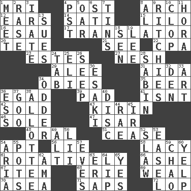 ACROSS 1. Medical imaging device (abbr.) 4. Mail 8. Bowlike part 12. Hearing organs 14. Suttee (variant) 15. _ and Stitch 16. He sold his birthright 17. Interpreter 20. False hair 21. Perceive with the eye 22. Accounting whiz (abbr.) 23. _____ Park, CO 27. Soft 29. Toward shelter 31. Opera by Verdi 34. Off-Broadway awards 35. Fermented drink made from hops 36. Mild oath 39. Writing tablet 41. Is not 42. Disposed of to a purchaser 43. Japanese brewing company 46. Not divided or shared with others 47. Austrian river, tributary to the Danube 48. Of the mouth 51. Stop 54. Fitting 56. Untruth 58. Made of lace 61. Producing rotation 66. American tennis player Robert 67. A whole individual unit 68. One of the Great Lakes 69. Welt 70. At sea 71. Plant excrements 72. Chop off DOWN 1. Rendezvous 2. To erase 3. Feeling or showing extreme anger 4. Pacific Standard Time (abbr.) 5. Rowing implement 6. R.R. building 7. Metal containers 8. Insect wing 9. Actors Guy, Robert Welles, and Clint 10. Hoof sound 11. Israeli folk dance 13. Takes to court 18. Elected rep. 19. Area sheltered from the wind 24. Bar bill 25. Biblical high priest 26. Ooze 28. Unit of acoustic absorption 30. 1973 Nobel Price Winner (Physics) Leo 32. Lair 33. Nonscientific branch of learning 34. More peculiar 36. Double-curved letter 37. Thick or sticky substance 38. One to whom something is allotted 40. Flat circle 44. Actress Charlotte 45. Lyricist Gershwin 49. The first octave above the treble staff 50. Cards in a Roman deck? 52. Cole _ (cabbage dish) 53. Artist's stand 54. Roberta Peters solo 55. Plant holders 57. Nights before holidays 59. US Secretary of Labor Elaine L. _ 60. Sharp bark 62. Nanny (var.) 63. Period 64. Mouth edge 65. Consenting reply