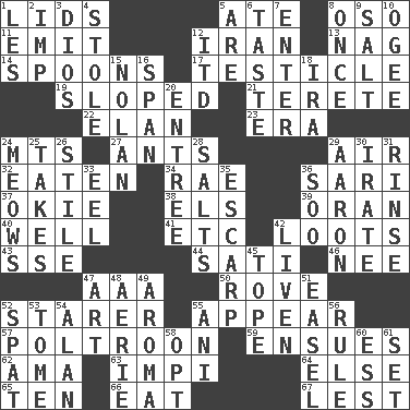 ACROSS 1. Flaplike coverings 5. Had dinner 8. Bear (Spanish) 11. Give off 12. SW Asia republic 13. Tired old horse 14. Soup utensils 17. A testis 19. Had an oblique or slanted direction 21. Cylindrical with tapered ends 22. Liveliness 23. Period 24. Mountains (abbr.) 27. Pismires 29. Wind 32. Consumed 34. Actress Charlotte 36. Indian skirt 37. Migrant worker of the '30s 38. Raised railways 39. Northwest Algerian city 40. Water source 41. And so on (abbr.) 42. Plunders 43. Compass dir. 44. Suttee (variant) 46. Born 47. American Automobile Association (abbr.) 50. Be footloose 52. A viewer who gazes fixedly 55. Become visible 57. Characterized by complete cowardliness 59. Follows as a consequence or result 62. Nursemaid (var.) 63. Body of Kaffir warriors 64. Otherwise 65. "___ Little Indians" 66. Consume 67. For fear that DOWN 1. French article 2. Mischievous child 3. "Vaya con ____" 4. Fur scarf 5. "We ___ not amused" (Victoria) 6. Clothes sense 7. Keyboard key 8. Single time 9. Table seasoning 10. Double curve, resembling the letter S 12. It would 15. Pitcher Ryan 16. Connect, as a bridge 18. Retirement account (abbr.) 20. Main course 24. Catcalls? 25. Receives possession of 26. Vertical member of a panel or frame 28. Table seasonings 29. Composer Copland 30. Feeling or showing extreme anger 31. Wash lightly 33. Snakelike fish 35. Fortification 36. "Barney Miller" actor Jack 42. Make or become more lively 45. Drink excessively 47. Nonscientific branch of learning 48. Nest on high 49. Scent 51. Artist's stand 52. Petty quarrel 53. Heavy book 54. ____ Jay Lerner 55. Black tropical American cuckoo 56. General guideline 58. Elect 60. Double-curved letter 61. Arrange properly for use