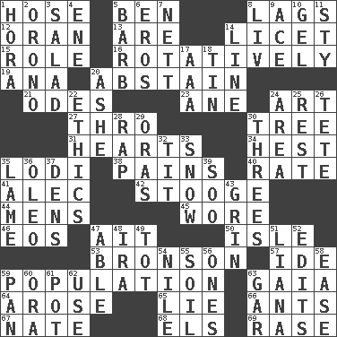 ACROSS 1. Stockings 5. Benjamin's nick name 8. Falls behind 12. NW Algerian seaport 13. "We ___ not amused" (Victoria) 14. It is permitted: Lat. 15. Hero or heavy, e.g. 16. Happening in regular succession 19. Santa ___, CA 20. Refrain by choice 21. Lyric poems 23. A saturated hydrocarbon 24. Nonscientific branch of learning 27. Through, poetically 30. Woody plant 31. Centers 34. Behest 35. Farming town in central California 38. Aches 40. Pace 41. Actor Baldwin 42. Moe Howard, for one 44. Not women's 45. Had on 46. Greek goddess of the dawn 47. Small island 50. Small island 53. "Death Wish" actor 57. Binary compound 59. Census information 63. Greek goddess of the earth (variant) 64. Came up 65. Falsehood 66. Pismires 67. Nathan's nickname 68. Raised railways 69. To erase DOWN 1. Israeli folk dance 2. U. of Maine site 3. Vegetable dish 4. Compass dir. 5. Sharp remark 6. Greek god of love 7. Remaining after all deductions 8. 54 in ancient Rome 9. Adept person 10. Set 11. Filthy place 14. Actor's bit 17. American Automobile Association (abbr.) 18. Shallow baking pan 20. American tennis player Robert 22. Moral principles 24. Type of rug 25. Repose 26. Wig 28. Reproach for some lapse or misdeed 29. Mouths or openings 30. Triads 32. Teat (slang) 33. Overwhelm 35. Unable to walk 36. Butter sub 37. Habitations of wild animals 39. "Barney Miller" actor Jack 43. Amused look 47. Competent 48. Lyricist Gershwin 49. Small child 51. Climbing, woody, usually tropical vines 52. Proofreads 54. "Death on the ____" 55. Land 56. Washington bills 58. Comfort 59. Baking dish 60. Mouth or opening 61. Plant holder 62. Purpose 63. Slender fish