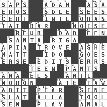 ACROSS 1. Plant excrements 5. First man 9. White ___ sheet 12. Greek god of love 13. Not divided or shared with others 14. Perceives with the eye 15. Foregone conclusion 16. International (abbr.) 17. Mouths or openings 18. Make lace 19. Drinking establishment 21. Annoying sound 22. Reuben's nickname 24. Small moist lump or mass 26. Car or cant ending 27. Before Barbara or Clara 28. Capital of Latvia 29. Capital of Western Samoa 30. Collection of objects 32. American tennis player Robert 36. Electrical Unit 37. Wedding promise 38. Travels 39. Celtic language 40. Prepares for publication 42. Blunders 43. Adolescent 44. Leg coverings 46. Santa ___, CA 49. Raised railways 50. Opposed to 51. Person of subnormal intelligence 53. Had dinner 54. The 23rd letter of the Hebrew alphabet 57. "This won't hurt ____!" 58. Lightbulb-shaped fruit 61. Trig term 62. Narrow board 63. Silent film actress Nazimova 64. Instrument 65. Elected rep. 66. Shaw product 67. Of or related to the anus DOWN 1. Religious group 2. Length times width 3. Likenesses of persons 4. Fast jet (abbr.) 5. SW Saudi Arabia district 6. Spanish title 7. Keyboard modifier key 8. Cartoonist voice _ Blanc 9. Nest on high 10. Gospel singer Marvin 11. NE Netherlands city 14. "Barney Miller" actor Jack 19. With the exception that 20. Blind as ____ 21. Basketball assoc. 23. Maternal 24. A piece of turf (Scot.) 25. Personal question 27. Practice fight 28. "The Thinker" sculptor 29. Deep reverence 31. Amusement-park features 32. Rep 33. Conclusion 34. Possessive pronoun 35. Curvy letter 40. Snakelike fish 41. Petty quarrel 43. Nine, plus one 45. A saturated hydrocarbon 46. Collect or gather 47. Having high moral qualities 48. Believer in; advocate of (suffix) 52. Baseball player Mel 53. Like ___ of sunshine 55. Small Philippine buffalo 56. Water source 58. Infant food 59. Pipe bend 60. Wing 61. R.R. building