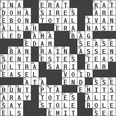 ACROSS 1. _ tizzy (2 wds.) 4. Part of Q.E.F. 8. Krazy ___ of comics 11. Capital of the state of Qatar 13. Founders of families 15. "We ___ not amused" (Victoria) 16. Inky black, to poets 17. Add up to 18. _ the terrible 19. Assad's deity 21. Period 22. Political cartoonist Thomas 23. Directed 24. Housemaid (var.) 27. Container for groceries 29. Dutch treat 30. Gospel singer Marvin 34. Prohibit 36. Precipitation 39. NE Netherlands city 40. Emitted 41. _____ Park, CO 43. Beverages made from leaves 44. Extreme 46. Indian skirt 47. Hearing organ 48. Artist's stand 49. State of nonexistence 51. _ moment's notice (2 wds.) 53. Conclusion 54. Compass dir. 57. The smallest animal of a litter 60. Parent Teacher Assoc. 63. Sends forth 65. Like ___ of sunshine 66. Lugs 69. Set down 70. Declare 71. Fur scarf 72. Hero or heavy, e.g. 73. Raised railways 74. Send forth 75. Observe DOWN 1. Perfect 2. Having high moral qualities 3. Hold, grip (Informal) 4. Eastern Standard Time (abbr.) 5. _ de Janeiro 6. Johnson of "Laugh-In" 7. Rend 8. Polynesian shrub of the pepper family 9. Ancient river in northeast Turkey 10. Portable shelter 12. Santa ___, CA 14. Thick slice 18. Consumed 20. Possessed 25. Female horse 26. Collect or gather 28. White ___ sheet 29. Plea 31. At sea 32. Dry up 33. Followers of ems 34. Actor Lugosi 35. Pismires 37. Call ___ day 38. Impudent aggressiveness 40. Institute legal proceedings 42. The Jewish people; Israel 45. The first octave above the treble staff 50. Binary compound 52. Tenement units (abbr.) 54. Grain storage towers 55. Vertical member of a panel or frame 56. First name in cosmetics 57. Raze (variant) 58. Mountain range 59. Negative votes 61. Carryall 62. Smallest unit of an element 64. Spoil 67. Connecticut Ivy Leaguer 68. Arrange properly for use