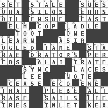 ACROSS 1. Arrange properly for use 4. Lacking originality or spontaneity 9. Institutes legal proceedings 13. Mouth or opening 14. Grain storage towers 15. Blunders 16. Lubricate 17. Follow as a consequence or result 18. 90 degrees 19. Shade tree 21. Police officer (slang) 22. Dipping utensil 24. A blast of a horn 26. Single 27. Acquire or gain knowledge or skills 29. SW Saudi Arabia district 30. Stared at amorously 31. Not wild 33. R.R. building 36. Actress Charlotte 37. Speakers 40. For each 41. Begley and Asner 42. Mountain range southwest of Kyrgyzstan 43. Feeling or showing extreme anger 45. Synchronize (abbr.) 47. Shoestrings 48. Area sheltered from the wind 49. Brief written record 50. Stop 52. Environmental prefix 54. She-sheep 56. Not this but _ 57. Cadet 59. The first octave above the treble staff 61. Raze (variant) 62. Travel by water 63. Untruth 64. Angers 65. An arm off of a larger body of water 66. A weed DOWN 1. "Barney Miller" actor Jack 2. 4th largest of the Great Lakes 3. Baron Munchausen's specialties 4. Compass dir. 5. Colored lightly or faintly 6. In addition 7. Central Nebraska county 8. Compass dir. 9. Sowing specialist 10. Mountain range 11. Celtic language 12. Fast jet (abbr.) 20. Greater amount 22. Failure 23. Cuckoo 25. Southwest Nigerian state 27. Old wives' tales, e.g. 28. Mild oath 29. Mine, in Marseilles 31. Baby powder 32. "One Day ___ Time" 33. High altitude stroll 34. Wig 35. Ancient Greek god of war 38. The wife of a rajah (variant) 39. Grain storage tower 44. Assign a rank or rating to 45. Chalkboards 46. It is so 49. Having high moral qualities 50. Burn to charcoal 51. Comfort 52. Style 53. To provide with a ceiling 55. Writer Wiesel 56. Three (prefix) 57. Air pressure measure (abbr.) 58. Eastern Standard Time (abbr.) 60. John Ritter's dad
