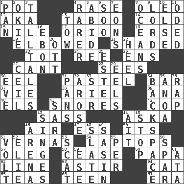 ACROSS 1. Plant holder 4. To erase 8. Margarine 12. Alias (abbr.) 13. Off limits 14. Chilled 15. Mediterranean tributary 17. Constellation of myth 18. Celtic language 19. Turned at an angle; bent 21. Cast a shadow over 23. Small child 24. To sift 26. Followers of ems 27. Patter 28. Perceives with the eye 30. Snakelike fish 31. Soft color 34. Oblong piece of solid material 37. Compete 38. Satellite of Uranus 39. Santa ___, CA 40. Raised railways 41. Sounds asleep 42. Police officer (slang) 43. Backtalk 44. "____ silly question..." 46. Atmosphere 47. Double-curved letter 50. It is 51. Actresses Bloom and Felton 54. Portable computers 57. Cassini of fashion 58. Desist 60. Dad 62. Actor's bit 63. Being in motion 64. Domesticated feline 65. Afternoon social gatherings 66. Adolescent 67. Epoch DOWN 1. Baking dish 2. Migrant worker of the '30s 3. Baron Munchausen's specialties 4. More valued for its uncommonness 5. Tolerate 6. "Barney Miller" actor Jack 7. Immeasurably long periods of time 8. Seas 9. Nobles 10. Otherwise 11. Wrote a lyric poem 13. Pull behind 16. Inky black, to poets 20. Baseball player Mel 22. The bottom of a shoe or boot 25. First name in cosmetics 27. To provide with a ceiling 29. Snakelike fish 30. First lady 31. Zero-star reviews 32. Came up 33. Title for a knight 34. Keyboard key 35. Small Philippine buffalo 36. Reproach for some lapse or misdeed 41. "Two Mules for Sister ____" 43. Scorches 44. Small island 45. Cease 46. Sports stadium 48. Chalkboard 49. Indian antelope 51. Electrical Unit 52. Writer Wiesel 53. Leave at once 55. For each 56. Coast Guard woman 59. Compass dir. 61. _ moment's notice (2 wds.)