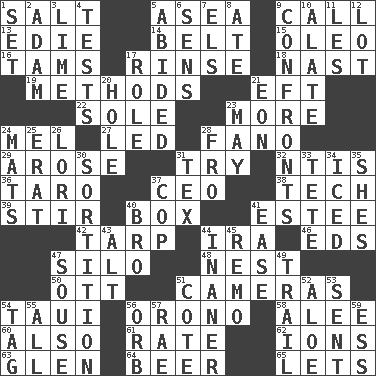 ACROSS 1. Table seasoning 5. Toward the sea 9. Give a ring to 13. Singer Brickell 14. Waist strap 15. Butter sub 16. Scottish caps 17. Wash lightly 18. Political cartoonist Thomas 19. Modes 21. Newt 22. Not divided or shared with others 23. Greater amount 24. Cartoonist voice _ Blanc 27. Directed 28. Papal veil 29. Came up 31. Attempt to accomplish something 32. Nuclear Threat Initiatives 36. Pacific island yam 37. Corporate head (abbr.) 38. Technical work 39. Use a spoon 40. Gift holder 41. First name in cosmetics 42. Canvas cover 44. Lyricist Gershwin 46. Begley and Asner 47. Grain storage tower 48. Egg locale 50. Baseball player Mel 51. Devices for capturing images 54. "Change" in Tahitian 56. U. of Maine site 58. Toward shelter 60. In addition 61. Assign a rank or rating to 62. Charged atoms 63. Small, secluded valley 64. Fermented drink made from hops 65. Allows DOWN 1. Put into a specified state 2. First of billions? 3. Welles in "The Third Man" 4. Trials 5. Remained 6. Elected reps. 7. Raised railways 8. Had dinner 9. Meets 10. Having winglike extensions 11. French article 12. Car dealer's back yard 17. Hero or heavy, e.g. 20. Hollow 21. Age 23. Fifth month 24. Floor coverings 25. Part of Q.E.F. 26. Australian parrot (variant) 28. From 30. Decision 31. John Ritter's dad 33. Wig 34. On the rocks 35. "______ My Girl" (Turtles hit) 37. Police officer (slang) 40. Sis' sibling 41. Relaxation 43. The first octave above the treble staff 44. More lacking in sense or substance 45. San ____ (Riviera town) 47. Boozer 49. Hang back 51. ____ d'Azur (French Riviera) 52. Medicinal plant 53. Posted 54. Label 55. 100% 56. Globe 57. Actress Charlotte 59. Double-curved letter