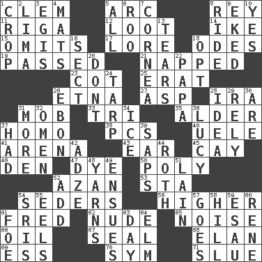 ACROSS 1. To starve (Brit.) 5. Curve 8. Marina Del _, California 11. Port city in Latvia 12. Plunder 14. D.D.E's nickname 15. Leaves out 17. Old wives' tales, e.g. 18. Lyric poems 19. Went by 21. Slept 23. Small bed 25. Part of Q.E.F. 26. Inactive volcano in Sicily 27. Viper 28. Retirement account (abbr.) 31. Crowd into 33. Three (prefix) 35. Tree or shrub in the Birch family 37. Same (prefix) 38. Personal Computers (abbr.) 40. Ubangi River tributary 41. Sports stadium 43. Ewer handle 45. Island 46. Lair 47. Color 50. Much (prefix) 52. Muslim summons to prayer 53. R.R. building 54. Spring feasts 56. Having greater elevation 61. Flintstone 62. Unadorned 65. Annoying sound 66. Petroleum 67. Lick closed 68. Liveliness 69. Curvy letter 70. Symbol (abbr.) 71. Change direction abruptly DOWN 1. Riding implement 2. Pale green bean 3. The front part of a cuirass 4. Floor coverings 5. Everything 6. Friend of Pooh 7. Pupil covering 8. Travel on or in a vehicle 9. Made supply last 10. Affirmative reply 13. Rends 16. Religious group 18. Elect 20. Do not 22. Dad 24. Canvas cover 26. Inky black, to poets 28. The content of cognition 29. Trust 30. "We ___ not amused" (Victoria) 31. Greater amount 32. Sign of things to come 34. Frozen water 36. "I Love _" 37. Possessed 39. Plant excrements 42. Edge tool used to cut and shape wood 44. Writer of Portnoy's Complaint (1969) 48. Tall tales 49. Follows as a consequence or result 51. (Had) reclined 52. Increase 54. Indian titles of respect 55. Snakelike fish 57. Travels 58. Land elevation 59. He sold his birthright 60. French philosopher Descartes 61. Enemy 63. 24 hours 64. Shade tree