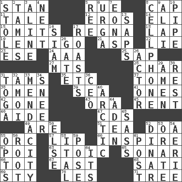 ACROSS 1. Comedian Laurel of Laurel & Hardy 5. Regret 8. Head covering 11. Story 12. Greek god of love 14. Connecticut Ivy Leaguer 15. Leaves out 17. Rain (Swedish) 18. Pet locale 19. Small, flat, pigmented spot on the skin 21. Cleo's killer 22. Whopper 23. Compass dir. 24. Auto club (abbr.) 25. Plant excrement 27. Mountains (abbr.) 28. Burn to charcoal 31. Scottish caps 35. And so on (abbr.) 37. Heavy book 38. Sign of something about to happen 39. Ocean 41. Washington bills 42. Went 43. Mouth or opening 45. Monthly bill 46. Helper 47. Music discs 49. "We ___ not amused" (Victoria) 51. Beverage made from leaves 52. ___ good deed 55. The grampus (Milton) 57. Mouth edge 60. Stimulate to action 62. Luau course 63. Unemotional 65. Echolocation 66. Small child 67. 90 degrees 68. Suttee (variant) 69. Filthy place 70. French article 71. Relationship diagram DOWN 1. Took without asking 2. Softens 3. Place in a line 4. Remaining after all deductions 5. Portuguese money of account (variant) 6. Capital and largest city of Mongolia 7. Immeasurably long periods of time 8. Portable communications device 9. Mountain range southwest of Kyrgyzstan 10. Corncob 13. Plant excrements 16. Thailand, formerly 17. Cooks with dry heat, as in an oven 20. Yard entry 26. Thespian 29. So be it 30. Respite 31. Ancient Roman robe 32. Mine, in Marseilles 33. Ananias' fault 34. Scornful expression 36. Corporate head (abbr.) 40. Northern region 44. An important port of Yemen 48. Backtalk 50. Otherwise 52. Middle Eastern gold or silver currency 53. Speak pompously 54. Nest on high 55. Elects 56. Carrot, for example 58. Slanted text style (abbr.) 59. Introduce or present, as a question 61. Mail 64. ___ a Wonderful Life