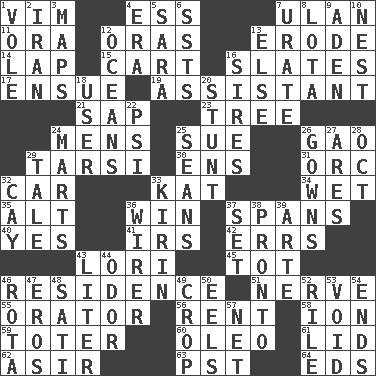 ACROSS 1. Zeal 4. Double-curved letter 7. ____ Bator, Mongolia 11. Mouth or opening 12. Mouths or openings 13. Eat (away) 14. Pet locale 15. Draw slowly or heavily 16. Chalkboards 17. Take place subsequently 19. Helper 21. Plant excrement 23. Family _ (genealogy) 24. Not women's 25. Take to court 26. E Mali city 29. Tarsus (plural) 30. Followers of ems 31. The grampus (Milton) 32. Auto 33. Krazy ___ of comics 34. Dripping 35. The first octave above the treble staff 36. Acquire through effort 37. Connects, as a bridge 40. Affirmative reply 41. Big collection agency 42. Blunders 43. Australian parrot (variant) 45. Small child 46. Home 51. Effrontery 55. Speaker 56. Monthly bill 58. Electrically charged atom 59. Carrier 60. Butter sub 61. Flaplike covering 62. SW Saudi Arabia district 63. Pacific Standard Time (abbr.) 64. Begley and Asner DOWN 1. Grand slam 2. SW Asia republic 3. Atlas contents 4. Period 5. "Two Mules for Sister ____" 6. Fast planes 7. A salt of uric acid 8. Globular water bottle used in Asia 9. Arabian gulf 10. A home for chicks 12. Seas 13. Otherwise 16. Begets 18. One who uses or employs something 20. Check the growth or development of 22. Air pressure measure (abbr.) 24. Shops 25. Actors Connery and Penn 26. Women's formal wear 27. Ancient Greek god of war 28. Sep. follower 29. Lie 32. Island 33. Japanese brewing company 36. One who wires 37. Arrange properly for use 38. Right away 39. Johnson of "Laugh-In" 43. 61 cubic inches 44. Aroma 46. Round or rotation of duties 47. Greek god of love 48. Suttee (variant) 49. Riding implement 50. Snakelike fish 52. Cause heat under the collar 53. Lacking any legal or binding force 54. Extremities 57. Fish or hair follower