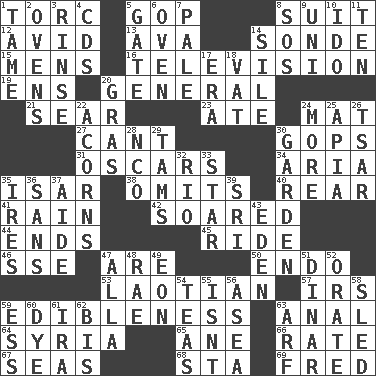 ACROSS 1. Torque (variant) 5. Grand Old Party 8. Set or collection 12. Enthusiastic 13. Actress Gardner 14. Message 15. Not women's 16. Boob tube 19. Followers of ems 20. Commissioned military rank 21. Singe 23. Had dinner 24. Floor protector 27. Patter 30. Republicans 31. Motion picture awards 34. Operatic vocal solo 35. Austrian river, tributary to the Danube 38. Leaves out 40. Hitchcock's "____ Window" 41. Precipitation 42. Flew 44. Conclusions 45. Travel on or in a vehicle 46. Compass dir. 47. "We ___ not amused" (Victoria) 50. Inside; within (prefix) 53. Of or relating to Laos or its people 57. Big collection agency 59. The property of being fit to eat 63. Of or related to the anus 64. Damascus' land 65. A saturated hydrocarbon 66. Assign a rank or rating to 67. Oceans 68. R.R. building 69. Flintstone DOWN 1. Docile 2. Baking chambers 3. Remove soap 4. Music discs 5. Yard entry 6. Baking chamber 7. Diluted with white 8. Mayday 9. University (slang) 10. Wedding promise 11. Nine, plus one 14. Drop; flow; fall 17. Period 18. Large container 20. Pate de foie ____ 22. Oak nuts 24. Greater amount 25. Capital of Western Samoa 26. Russian ruler of old 28. Non-commissioned officer (abbr.) 29. Scottish caps 30. Place where plants grow 32. _ de Janeiro 33. Play the lead 35. Angers 36. Without 37. Helper 39. Indian title of respect (Mr.) 43. Locale of original sin 47. Silent film actress Nazimova 48. Actress Charlotte 49. A really long time 51. Middle Eastern gold or silver currency 52. Speak pompously 54. Beverages made from leaves 55. Is not 56. Toward the sea 58. Downhill vehicle 59. Double-curved letter 60. Color 61. Retirement account (abbr.) 62. Altar cloth linen 63. Sandy's bark