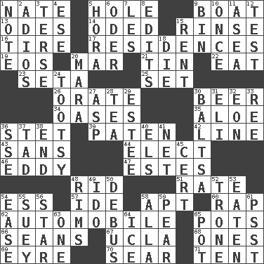 ACROSS 1. Nathan's nickname 5. Hollow 9. Water vessel 13. Lyric poems 14. Wrote a lyric poem 15. Wash lightly 16. Become fatigued 17. Dwellings 19. Greek goddess of the dawn 20. Spoil 21. Shallow baking pan 22. Erode 23. Stalk of a moss capsule 25. Arrange properly for use 26. Declaim 30. Fermented drink made from hops 34. Fertile tracts in a desert 35. Medicinal plant 36. Proofreading order 39. Eucharist need 42. Actor's bit 43. Without 44. Opt 46. Whirlpool 47. _____ Park, CO 48. To free from 51. Pace 54. Double-curved letter 57. Binary compound 58. Fitting 60. Reproach for some lapse or misdeed 62. Car 65. Plant holders 66. Actors Connery and Penn 67. Southern CA. univ. 68. Singles 69. Jane of fiction 70. Scorch 71. Portable shelter DOWN 1. Observe 2. Goodbye (Sp.) 3. Laconic 4. Compass dir. 5. Israeli folk dance 6. Baltic tributary 7. French article 8. Prepares for publication 9. Storage container 10. Single time 11. At sea 12. Trial 15. Monthly bill 18. Pass on 20. Hindu Mythology: god of death 24. A girl or young woman (variant) 27. Cleo's killer 28. Afternoon social gathering 29. First name in cosmetics 30. Greek mezzo-soprano Agnes 31. Biblical high priest 32. A really long time 33. To separate or throw off 36. Compass dir. 37. Small amount or degree 38. Conclusion 40. Raised railways 41. Fish or hair follower 45. Foregone conclusion 48. Basketball hoops 49. Wedding promise 50. Alight from a bus 52. Heavy duty weighing machine 53. Ingested 54. Relaxation 55. Chop _ 56. Play the lead 58. Silent film actress Nazimova 59. Lightbulb-shaped fruit 61. Inconspicuous attention getter 63. Single 64. Frozen water 65. Plant holder