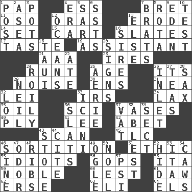 ACROSS 1. Infant food 4. Curvy letter 7. Cy Young winner Saberhagen 11. Bear (Spanish) 12. Mouths or openings 13. Eat (away) 14. Arrange properly for use 15. Heavy open wagon 16. Chalkboards 17. Clothes sense 19. Helper 21. Auto club (abbr.) 23. Angers 24. The smallest animal of a litter 25. Ripen 26. It is 29. Annoying sound 30. Followers of ems 31. Teachers' org. 32. Luau accessory 33. Big collection agency 34. Not strict 35. Lubricate 36. _-fi 37. Flower holders 40. Apply oneself diligently 41. Area sheltered from the wind 42. Collude with 43. Examine minutely or intensely 45. Affectionate concern, for short 46. Decision 51. Value system 55. Foolish or stupid persons 56. Republicans 58. Call ___ day 59. Impressive in appearance 60. For fear that 61. Fool 62. Celtic language 63. Connecticut Ivy Leaguer 64. Raised railways DOWN 1. Mail 2. Toward the sea 3. Cooking vessels 4. Epoch 5. "Two Mules for Sister ____" 6. Fast planes 7. Naughty children 8. Round or rotation of duties 9. Genesis locale 10. Trial 12. Seas 13. Otherwise 16. Male parents of animals 18. "Change" in Tahitian 20. Signals 22. Had dinner 24. Agitated, as a liquid 25. Nest on high 26. An arm off of a larger body of water 27. Afternoon social gatherings 28. Saxophone 29. Famous astronaut Armstrong 32. Trim (branches) 33. Ancient Celtic tribe of eastern Britain 36. Narrow boards 37. Large container 38. Most capable 39. Religious group 43. Fur scarf 44. Quote 46. Trig term 47. Aroma 48. Chest bones 49. Stare 50. Christmas carol 52. Flintstone garb 53. Slanted text style (abbr.) 54. Crow sounds 57. Air pressure measure (abbr.)