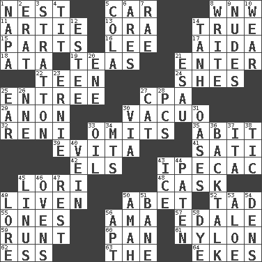 ACROSS 1. A home for chicks 5. Automobile 8. Compass dir. 11. Nick name for Arthur 13. Mouth or opening 14. Loyal 15. Pieces 16. Area sheltered from the wind 17. Opera by Verdi 18. _ moment's notice (2 wds.) 19. Beverages made from leaves 21. Keyboard key 22. Adolescent 24. "______ My Girl" (Turtles hit) 25. Main course 27. Accounting whiz (abbr.) 29. Soon (poet.) 30. In a vacuum (with "in") 32. Painter Guido (1575-1642) 33. Leaves out 35. "This won't hurt ____!" 39. Webber/Rice musical 41. Suttee (variant) 42. Raised railways 43. Medicinal drug used to evoke vomiting 45. Australian parrot (variant) 48. Keg 49. Make or become more lively 50. Collude with 52. Small boy 55. Singles 56. Nanny (var.) 57. Peak District village in England 59. Undersized animal 60. Baking dish 61. High-strength synthetic material 62. Curvy letter 63. Definite Article 64. Makes supply last DOWN 1. California wine valley 2. Part of Q.E.F. 3. Ski resort town in Vermont 4. Teat (slang) 5. Root beer relative 6. Ancient Greek god of war 7. Actress Charlotte 8. Compose 9. Unclothed pictures 10. Erode 12. First name in cosmetics 14. Hyperbolic tangent 20. Compass dir. 21. Son of Isaac 23. Bert's buddy 25. Ewer handle 26. Compass dir. 27. Domesticated feline 28. Personal Computers (abbr.) 30. By way of 31. Fertile tracts in a desert 33. Lubricate 34. Mountains (abbr.) 36. Sass 37. Call ___ day 38. Nervous spasm 40. Distinctive style or manner 43. Frozen water 44. Eucharist need 45. "_ and Lucy" (Charlie Brown theme song) 46. Baking chambers 47. Remainder 49. Old wives' tales, e.g. 50. Housemaid 51. Object of repulsion 53. Medicinal plant 54. Cub Scout units 56. Fitting 58. Color