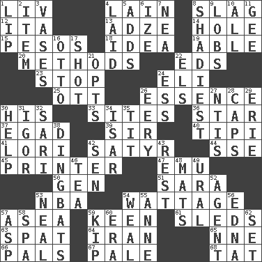 ACROSS 1. 54 in ancient Rome 4. (Had) reclined 8. Volcanic refuse 12. Call ___ day 13. Edge tool used to cut and shape wood 14. Opening into or through something 15. Mexican monetary units 18. The content of cognition 19. Competent 20. Modes 22. Begley and Asner 23. Cease 24. Connecticut Ivy Leaguer 25. Baseball player Mel 26. Substance 30. Part of HMS, perhaps 33. Locates 36. Play the lead 37. Mild oath 39. Title for a knight 40. Native american tent (variation) 41. Australian parrot (variant) 42. Letch 44. Compass dir. 45. Hard copy producer 47. Australian flightless bird 50. Commissioned mil. rank 51. "Two Mules for Sister ____" 53. Basketball assoc. 54. Electrical Measurement 57. Toward the sea 59. Peachy ____! 61. Bobsleighs 63. Petty quarrel 64. SW Asia republic 65. Compass dir. 66. Friends 67. Diluted with white 68. Make lace DOWN 1. Mouth edge 2. A distinct part 3. Flower holders 4. Put down 5. Sums up 6. Ending with capital 7. Teachers' org. 8. Most dark, concealed or hidden 9. Tennis shots 10. Everything 11. Turn to the right 16. Von Bismarck 17. Guess 21. Elects 22. Raised railways 24. Curvy letter 26. Suggestive of the supernatural 27. Nuclear Threat Initiatives 28. Balmoral and tarboosh 29. One of the Great Lakes 30. Assist 31. Composer Stravinsky 32. Indian skirt 34. Austrian river, tributary to the Danube 35. Teat (slang) 38. Empty-headed or silly people 42. Elected rep. 43. Remainder 46. Beverage made from leaves 48. Floor protectors 49. Mountain range 52. Rep 53. Be tempered by heat 54. Welt 55. Singer Murray 56. Pulitzer Prize-winning author Ferber 57. Viper 58. Health resort 59. Monetary unit of Laos 60. Epoch 62. Arrange properly for use