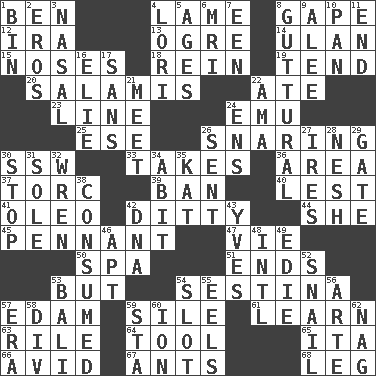ACROSS 1. Benjamin's nick name 4. Unable to walk 8. Yawn 12. Retirement account (abbr.) 13. Legendary monster 14. Uhlan (variant) 15. Olfactory organs 18. It's straight from the horse's mouth 19. Look after 20. Deli grouping 22. Had dinner 23. Actor's bit 24. Australian flightless bird 25. Compass dir. 26. Catching in a trap 30. Compass dir. 33. Proceeds 36. Length times width 37. Torque (variant) 39. Forbid 40. For fear that 41. Margarine 42. Short, simple song 44. A female animal or person 45. Pre-World Series prize 47. Compete 50. Health resort 51. Extremities 53. Yet 54. French poetic form 57. Dutch treat 59. Drop; flow; fall 61. Memorize 63. Cause heat under the collar 64. Utensil 65. Call ___ day 66. Enthusiastic 67. Pismires 68. Part of a journey DOWN 1. Storage container 2. Greek god of love 3. Relating to the nose 4. Australian parrot (variant) 5. Eons 6. Medical imaging device (abbr.) 7. Car or cant ending 8. From the throat 9. Toward shelter 10. Baking dish 11. Conclusion 16. Writer Wiesel 17. Without 21. Rendezvous 22. Wet nurse (var.) 24. Followers of ems 26. Posted 27. Angers 28. Delicate 29. Yard entry 30. Obstruct or block passage 31. Not divided or shared with others 32. Songbird 34. "This won't hurt ____!" 35. Krazy ___ of comics 38. Ingested 42. Heredity factor (abbr.) 43. Jacques Cousteau's middle name 46. Fitting 48. International (abbr.) 49. Singer Brickell 52. Slow-paced one 53. Indonesian resort city 54. Notch 55. Snakelike fish 56. Johnson of "Laugh-In" 57. Epoch 58. HTML Container Element 59. R.R. building 60. Electrically charged atom 62. Tired old horse