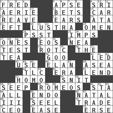 ACROSS 1. Flintstone 5. Domed church section 9. _ Lanka 12. Nest on high 14. Stakes 15. Auto 16. Break or tear apart 17. Hearing organs 18. "One Day ___ Time" 19. Lizard (obsolete) 20. A period of five years 23. Sign of something about to happen 24. Inconspicuous attention getter 25. Naughty children 27. Singles 30. Greek goddess of the dawn 32. Teachers' org. 33. Trial 34. College mil. group 36. Definite Article 38. Afternoon social gathering 39. Thick or sticky substance 40. Directed 43. Purpose 46. Flair 48. At sea 49. Affectionate concern, for short 51. Period 52. Grant temporary use of 53. Same (prefix) 54. In a ____ (agitated or irritated) 56. Ooze 58. Lover boys 61. R.R. building 64. Everything 65. Inside; within (prefix) 66. Relating to or accompanying birth 68. One more than two 69. Sew up the eyelids of hawks and falcons 70. Exchange 71. Corporate head (abbr.) 72. Comfort 73. Celtic language DOWN 1. Conductor's collection 2. Coral ridge 3. Part of Q.E.F. 4. HTML Container Element 5. Collude with 6. Lightbulb-shaped fruit 7. Put through a sieve 8. Double-curved letter 9. Fraudulent business schemes 10. Pace 11. SW Asia republic 13. Snakelike fish 21. One who uses or employs something 22. Moe Howard, for one 23. Brightly colored fish 24. Pacific Standard Time (abbr.) 26. Was introduced to 27. Baseball player Mel 28. Born 29. Son of Isaac 31. Fur scarf 35. Unrefined 37. Otherwise 41. Car or cant ending 42. Male parent 44. Discontinue 45. Shade tree 47. Billionth: prefix 48. The first octave above the treble staff 50. Pupil covering 53. Sun: prefix 55. Is not 56. Ketch in the Levant 57. Writer Wiesel 59. Lyric poems 60. Undercover agent 61. Play the lead 62. Small boys 63. Toward shelter 65. Compass dir. 67. "We ___ not amused" (Victoria)