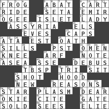ACROSS 1. Toadlike animal 5. Blind as ____ 9. Haul 13. Travel on an animal 14. Stalk of a moss capsule 15. Arab leader 16. Double curve, resembling the letter S 17. Small island 18. Kenny Rogers chart-topper in '80 19. Nineveh was its capital 21. Raised railways 22. Nights before holidays 23. Balmoral and tarboosh 24. _ moment's notice (2 wds.) 27. Eastern Standard Time (abbr.) 28. Pledge 29. Beverly of Met fame 31. Pacific Standard Time (abbr.) 32. Sign of things to come 36. Leg joint 37. Sandy's bark 38. Brief written record 39. Toward the sea 40. Compass dir. 41. To get out of a bus 42. Cook's measure (abbr.) 44. Three (prefix) 46. Be seated 47. Guess 48. Parka part 50. ___ Haven, CT 51. Thinks logically 54. Play the lead 56. Suffix with ecto or cyto 58. Letter starter 60. Migrant worker of the '30s 61. Quote 62. Yard entry 63. Exchanged or delivered for money 64. Observes 65. Writer Wiesel DOWN 1. Back 2. Capital of Latvia 3. Lyric poems 4. Honkers 5. Aid 6. Actor Lugosi 7. Had dinner 8. Make lace 9. Portable communications device 10. Collect or gather 11. To free from 12. Attempt to accomplish something 17. Angers 20. Jacques Cousteau's middle name 21. Consume 23. Feline 24. "____ silly question..." 25. Metal containers 26. Toward shelter 28. Order of Saint Francis (abbr.) 30. Resembling or made to resemble leather 31. Before (prefix) 33. Disorderly crowds 34. Needle case 35. A home for chicks 37. Viper 40. Fast jet (abbr.) 41. "Vaya con ____" 43. Arrow shooter 44. College papers 45. Wander 47. Slow-paced one 49. Evade 51. Assign a rank or rating to 52. Anneal 53. Suttee (variant) 54. Distress signal 55. Ring climax 56. Personal Computers (abbr.) 57. Untruth 59. To sift