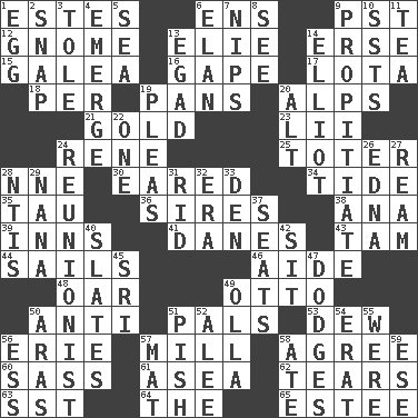 ACROSS 1. _____ Park, CO 6. Followers of ems 9. Pacific Standard Time (abbr.) 12. Dwarf 13. Writer Wiesel 14. Celtic language 15. An organ shaped like a helmet 16. Stare wonderingly 17. Globular water bottle used in Asia 18. For each 19. Baking dishes 20. High mountains 21. Aureate 23. Cards in a Roman deck? 24. French philosopher Descartes 25. Carrier 28. Compass dir. 30. Having ears or earlike features 34. Periodic rise and fall of the sea level 35. The 19th letter of the Greek alphabet 36. Fathers 38. Santa ___, CA 39. Restaurants 41. Natives or inhabitants of Denmark 43. Scottish cap 44. Moves on water 46. Assistant 48. Boat paddle 49. "Beetle Bailey" pooch 50. Against 51. Friends 53. Morning condensation 56. One of the Great Lakes 57. Place where flour is made 58. Match 60. Backtalk 61. Toward the sea 62. Lacerates 63. Fast jet (abbr.) 64. Definite Article 65. First name in cosmetics DOWN 1. Ovum 2. Fastener 3. Lacquered or enameled metalware 4. Develop 5. Ocean 6. Style 7. Pinches, bites 8. Observe 9. Conciliate 10. Fast planes 11. Afternoon social gathering 13. Mild oath 14. American author Paul (1891-1958) 19. Entreaties 20. Keyboard modifier key 22. Single 24. One who advocates reunion 26. Pulitzer Prize-winning author Ferber 27. 480, 500 or 516 sheets of paper 28. Nuclear Threat Initiatives 29. Grandmother 31. To free from 32. Epoch 33. Lair 37. Theater features 40. Chalkboards 42. Be seated 45. _ Lanka 47. Evades 49. Rounded earthenware pot or jar 50. Caspian sea tributary 51. Expression of disdain 52. Toward shelter 54. Part of Q.E.F. 55. We are 56. Curvy letter 57. Floor covering 58. Had dinner 59. Compass dir.