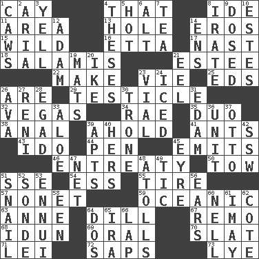 ACROSS 1. Island 4. Not this but _ 8. Binary compound 11. Type of rug 13. Hollow 14. Greek god of love 15. Uncontrolled 16. Singer James 17. Political cartoonist Thomas 18. Deli grouping 21. First name in cosmetics 22. Create 23. Compete 25. Begley and Asner 26. "We ___ not amused" (Victoria) 29. A testis 32. Viva Las _ 34. Actress Charlotte 35. Superhero pair 38. Of or related to the anus 39. Hold, grip (Informal) 41. Pismires 43. Wedding promise 44. Animal enclosure 45. Sends forth 46. Plea 50. Pull behind 51. Compass dir. 54. Curvy letter 55. Hoop that covers a wheel 57. Music written for nine 59. Pertaining to the sea 63. Singer Murray 64. Deli pickle 67. San ____ (Riviera town) 68. Goddess of spring and wife of Bragi 69. Taken by mouth 70. Narrow board 71. Flowery wreath 72. Plant excrements 73. Sodium hydroxide DOWN 1. Crow sounds 2. Operatic vocal solo 3. Shout 4. College papers 5. Being at a high temperature 6. The first octave above the treble staff 7. Beverage made from leaves 8. Feeling or showing extreme anger 9. Administered medicine 10. _____ Park, CO 12. First man 14. Followers of ems 19. Floor protectors 20. Mamie's husband 21. Snakelike fish 23. Small bottle 24. On the rocks 26. Actress Gardner 27. Painter Guido (1575-1642) 28. Mild oath 30. Marketplace scale 31. Dutch treat 33. Medicinal plant 36. A single undivided whole 37. Von Bismarck 39. Flats, for short 40. Possessive pronoun 42. Compass dir. 45. Jane of fiction 47. Fish or hair follower 48. Ringlike coral islands and reefs 49. Nervous spasm 51. Slow-paced one 52. Message 53. World-weariness 56. Hearing organs 58. Car or cant ending 60. 1994 drama film starring Jodie Foster 61. "If ____ say so..." 62. ____ d'Azur (French Riviera) 64. Two (Sp.) 65. Retirement account (abbr.) 66. Infant locale