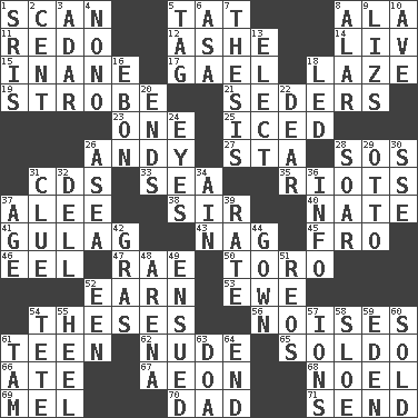 ACROSS 1. Glance over 5. Make lace 8. Insect wing 11. Redecorate 12. American tennis player Robert 14. 54 in ancient Rome 15. Silly 17. Highlander 18. Goldbrick 19. Disco prop 21. Spring feasts 23. Single 25. On the rocks 26. "60 Minutes" Commentator Rooney 27. R.R. building 28. Distress signal 31. Music discs 33. Ocean 35. Debaucheries 37. Toward shelter 38. Title for a knight 40. Nathan's nickname 41. Russian prison camp 43. Tired old horse 45. Away 46. Snakelike fish 47. Actress Charlotte 50. "Corrida" creature 52. Merit 53. She-sheep 54. College papers 56. Annoying sounds 61. Adolescent 62. Naked 65. Twentieth part of a lira 66. Had dinner 67. A really long time 68. Christmas carol 69. Cartoonist voice _ Blanc 70. Male parent 71. Transmit DOWN 1. Indian titles of respect 2. Penny 3. The sixth month of the Jewish calendar 4. Words to Nanette 5. Label 6. White ___ sheet 7. College paper 8. Having or resembling wings 9. Belonging to Elizabeth 10. "___ Maria" 13. Opt 16. Inky black, to poets 18. Directed 20. Conclusions 22. Letter starter 24. Snake ____ (dice throw) 26. At sea 28. Fly high 29. Von Bismarck 30. Compass dir. 31. A slight indication 32. Small valley 34. The 18th letter of the Arabic alphabet 36. A message received and understood 37. Mature 39. Assign a rank or rating to 42. Pate de foie ____ 44. Bride's dress 48. Sports stadium 49. Took place subsequently 51. Vintage cars 52. Car or cant ending 54. Wig 55. The bottom of a shoe or boot 57. Charged atoms 58. _ gin 59. Locale of original sin 60. Disposed of to a purchaser 61. Scottish cap 63. ___ good deed 64. Conclusion