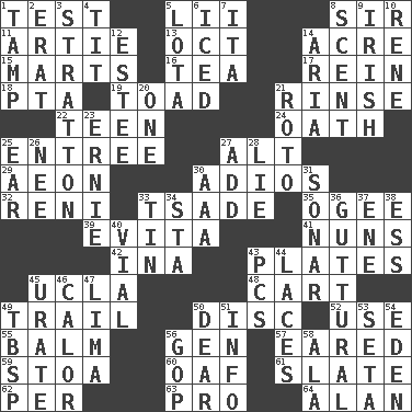 ACROSS 1. Trial 5. Cards in a Roman deck? 8. Title for a knight 11. Nick name for Arthur 13. Sep. follower 14. Measure of real estate 15. Shops 16. Afternoon social gathering 17. It's straight from the horse's mouth 18. Parent Teacher Association (abbr.) 19. Frog relative 21. Remove soap 22. Adolescent 24. Pledge 25. Main course 27. The first octave above the treble staff 29. A really long time 30. Goodbye (Sp.) 32. Painter Guido (1575-1642) 33. Sadhe (variant) 35. Double curve, resembling the letter S 39. Webber/Rice musical 41. Religious women 42. _ tizzy (2 wds.) 43. Food holders 45. Southern CA. univ. 48. Haul 49. Hang back 50. Plate 52. Purpose 55. Lip ointment 56. Commissioned military rank (abbr.) 57. Having ears or earlike features 59. Portico 60. Clumsy lout 61. Schedule 62. For each 63. Adept person 64. ____ Jay Lerner DOWN 1. Pack (down) 2. Part of Q.E.F. 3. Ski resort town in Vermont 4. Teat (slang) 5. Globular water bottle used in Asia 6. On the rocks 7. Call ___ day 8. Aroma 9. From or relating to Ireland 10. French philosopher Descartes 12. First name in cosmetics 14. Operatic vocal solo 20. Single 21. Printing process, for short 23. Bert's buddy 25. Hearing organ 26. Born 27. Find the sum of 28. Falsehood 30. Auto club (abbr.) 31. Underwater navigation system 33. Metal container 34. R.R. building 36. From the throat 37. Compass dir. 38. Curvy letter 40. Small bottle 43. Personal Computers (abbr.) 44. Shoestrings 45. A salt of uric acid 46. Bodily heat indicating an inflammation 47. Pale green bean 49. Cook's measure (abbr.) 50. Letter starter 51. A message received and understood 53. Stalk of a moss capsule 54. Genesis locale 56. Grand Old Party 58. Wing