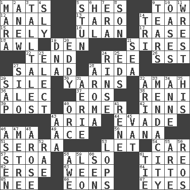 ACROSS 1. Floor protectors 5. "______ My Girl" (Turtles hit) 9. Pull behind 12. Of or related to the anus 13. Edible starchy tuberous root 14. Lacerate 15. Depend 16. ____ Bator, Mongolia 17. To erase 18. Leather borer 19. Lair 21. Founders of families 22. Be inclined (to) 24. To sift 26. Fast jet (abbr.) 27. First course 28. Opera by Verdi 29. Filth; sediment 30. Entertaining tales 32. Wet nurse 36. Actor Baldwin 37. Greek goddess of the dawn 38. Painter Guido (1575-1642) 39. Mail 40. Abalone 42. Taverns 43. Roberta Peters solo 44. Dodge 46. Nursemaid (var.) 49. Adept person 50. Nanny 51. Spanish missionary in California 53. Allow 54. Auto 57. Portico 58. In addition 61. Hoop that covers a wheel 62. Celtic language 63. Shed a tear 64. "Tell ____ the Marines!" 65. Born 66. Immeasurably long periods of time 67. Snake ____ (dice throw) DOWN 1. Hindu Mythology: god of death 2. Afresh 3. Baron Munchausen's specialties 4. Stealthy 5. Surprise greatly 6. Actor Linden 7. Period 8. Male child 9. Separates forcefully 10. Fertile tracts in a desert 11. Take or capture by force 14. Three (prefix) 19. Heredity factor (abbr.) 20. Whirlpool 21. Ocean 23. Voters do this 24. Remove soap 25. Begley and Asner 27. Grain storage tower 28. Scent 29. Plant excrement 31. Nest on high 32. Believer in; advocate of (suffix) 33. Ananias' fault 34. Singer Murray 35. Part of HMS, perhaps 40. The grampus (Milton) 41. French philosopher Descartes 43. American Automobile Association (abbr.) 45. Large container 46. NE Netherlands city 47. Distance measurement (Brit.) 48. Came up 52. Actress Charlotte 53. Chops off 55. Johnson of "Laugh-In" 56. Vintage cars 58. Deep reverence 59. Lion 60. Elected rep. 61. Make a knot