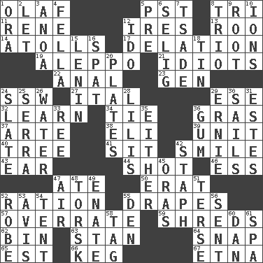 ACROSS 1. Norwegian king 5. Pacific Standard Time (abbr.) 8. Three (prefix) 11. French philosopher Descartes 12. Angers 13. Friend of Pooh 14. Ringlike coral islands and reefs 17. Conveyance 19. City in Syria 21. Foolish or stupid persons 22. Of or related to the anus 23. Commissioned military rank (abbr.) 24. Compass dir. 27. Slanted text style (abbr.) 29. Compass dir. 32. Memorize 34. Make a knot 36. Pate de foie ____ 37. Johnson of "Laugh-In" 38. Connecticut Ivy Leaguer 39. A single undivided whole 40. Woody plant 41. Be seated 42. Grin 43. Ewer handle 44. Went for two points 46. Curvy letter 47. Had dinner 50. Part of Q.E.F. 52. Food allowance for one day 55. Window treatments 57. Make much ado about nothing 59. Fragments 62. Storage container 63. Comedian Laurel of Laurel & Hardy 64. Fastener 65. Eastern Standard Time (abbr.) 66. Cask 67. Inactive volcano in Sicily DOWN 1. Mouth or opening 2. Allow 3. Small Philippine buffalo 4. Chap (slang) 5. Before (prefix) 6. Former Milwaukee Brewers owner Bud 7. Sadhe (variant) 8. Musical group of three 9. Carrot, for example 10. Charged particles 12. Wedding promise 15. Soviet premier 1918-24 16. Petty quarrel 18. Metal container 20. Food holders 24. Chalkboard 25. Spanish missionary in California 26. Wetness 28. Ms. Damita and namesakes 29. Bert's buddy 30. Travel by water 31. _____ Park, CO 33. Portuguese money of account (variant) 35. One or the other 36. Chewing product 42. Staphylococcus 45. Mouths or openings 47. Wind 48. Cod relative 49. Related on the mother's side 51. Laconic 52. Loose flowing garment 53. Opinion 54. Portable shelter 55. Lair 56. Posted 58. Label 60. Daniel's nick name 61. Health resort