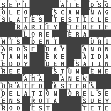 ACROSS 1. Back-to-school mo. 5. Had dinner 8. Bear (Spanish) 11. Margarine 12. Glance over 13. Tired old horse 14. Chalkboards 17. One of the two male reproductive glands 19. Noteworthy scarcity 21. Cigar-shaped 22. Old wives' tales, e.g. 23. Epoch 24. Mountains (abbr.) 27. Gouge 29. RI univ. 32. Came up 34. 24 hours 36. Soon (poet.) 37. Hyperbolic tangent 38. Supplement with great effort 39. Opera by Verdi 40. Whirlpool 41. Lair 42. Smooth fabric 43. Portuguese money of account (variant) 44. Surprise greatly 46. Compass dir. 47. Nanny (var.) 50. Afresh 52. Declaimed 55. Michaelmas daisies 57. Accusation by an informer 59. Threatening words 62. Followers of ems 63. Round or rotation of duties 64. Chop _ 65. Friend of Pooh 66. Eastern Standard Time (abbr.) 67. False hair DOWN 1. Distress signal 2. Pipe bend 3. Lightbulb-shaped fruit 4. "_____ Recall" 5. Adept person 6. Clothes sense 7. Keyboard key 8. Single time 9. Table seasoning 10. Double curve, resembling the letter S 12. Filthy place 15. Eat (away) 16. Beget 18. Retirement account (abbr.) 20. Looked after 24. Mother 25. Buy and sell 26. Something which is sent 28. Proceeds 29. Join together 30. "The Thinker" sculptor 31. Silly 33. Like a shrinking violet 35. Gossips 36. Auto club (abbr.) 42. Scornful expression 45. To (old English) 47. "One Day ___ Time" 48. Distance measurement (Brit.) 49. Goodbye (Sp.) 51. Obtain by seizing forcibly or violently 52. River in Europe 53. Former U.S. Attorney General Janet 54. In addition 55. Santa ___, CA 56. Turn sharply 58. Baseball player Mel 60. Put into a specified state 61. Sight organ