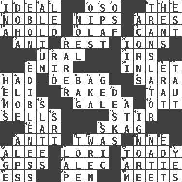 ACROSS 1. Standard of perfection 6. Bear (Spanish) 9. Definite Article 12. Impressive in appearance 13. Cuts off 14. Ancient Greek god of war 15. Hold, grip (Informal) 16. Norwegian king 17. Patter 18. Black tropical American cuckoo 19. Respite 20. Charged particles 21. Mountain range 23. Big collection agency 24. Independent ruler or chieftain 25. An arm off of a larger body of water 28. Possessed 30. Debunk (Brit. slang) 34. "Two Mules for Sister ____" 35. Biblical high priest 36. Moved through 38. The 19th letter of the Greek alphabet 39. Disorderly crowds 41. An organ shaped like a helmet 43. Baseball player Mel 44. Makes a sale 46. Commotion 48. Hearing organ 49. Heroin 50. Opposed to 51. It was, poetically 53. Compass dir. 56. Toward shelter 57. Australian parrot (variant) 58. Sycophant 60. Global Positioning Systems (abbr.) 61. Actor Baldwin 62. Nick name for Arthur 63. Curvy letter 64. Fenced enclosure 65. Confronts DOWN 1. _ tizzy (2 wds.) 2. Capital of the state of Qatar 3. Inky black, to poets 4. Plant genus of onion and garlic 5. Directed 6. Lubricates 7. Argument over a trivial matter 8. Order of Saint Francis (abbr.) 9. Interpreter 10. Coop moms 11. Eastern Standard Time (abbr.) 13. Christmas carol 14. Oak nuts 19. More uncommon 20. One more than two 22. To free from 24. The property of being fit to eat 26. Part of Q.E.F. 27. Pulled tight 28. Equivocates 29. _ vera 31. Container for groceries 32. Alias (abbr.) 33. Set 37. Writing tables 40. Chalkboards 42. _ moment's notice (2 wds.) 45. Indian title of respect (Mr.) 47. Snub 49. Ketch in the Levant 50. High mountains 51. Lacquered or enameled metalware 52. Songbird 54. Nathan's nickname 55. Prepare for publication 56. Mature 57. Pet locale 58. Scottish cap 59. Affirmative reply