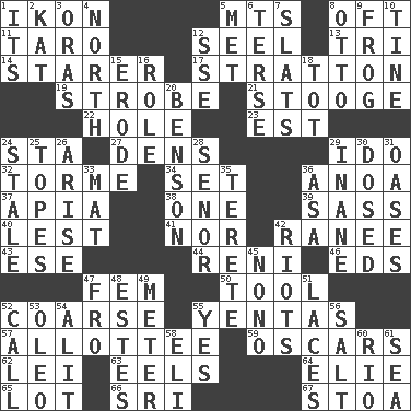 ACROSS 1. Picture 5. Mountains (abbr.) 8. Often (poetically) 11. Edible starchy tuberous root 12. Sew up the eyelids of hawks and falcons 13. Three (prefix) 14. A viewer who gazes fixedly 17. Ski resort town in Vermont 19. Disco prop 21. Moe Howard, for one 22. Hollow 23. Eastern Standard Time (abbr.) 24. R.R. building 27. Hiding places for outlaws 29. Wedding promise 32. Singer Mel 34. Arrange properly for use 36. Small Philippine buffalo 37. Capital of Western Samoa 38. Single 39. Backtalk 40. For fear that 41. Not either 42. Indian princess (variant) 43. Compass dir. 44. Painter Guido (1575-1642) 46. Begley and Asner 47. Opposite of masc. 50. Implement 52. Rough 55. Gossips 57. One to whom something is allotted 59. Motion picture awards 62. Luau accessory 63. Snakelike fish 64. Writer Wiesel 65. Car dealer's back yard 66. Indian title of respect (Mr.) 67. Portico DOWN 1. ___ a Wonderful Life 2. Krazy ___ of comics 3. Mouths or openings 4. _ pole 5. Was introduced to 6. Laconic 7. Narrow boards 8. Von Bismarck 9. Tree-dwelling hopper 10. Prong on a fork 12. Compass dir. 15. Eat (away) 16. Hero or heavy, e.g. 18. Small child 20. Gillaume's butler role 24. Lacking originality or spontaneity 25. Drinks excessively 26. Ascend 28. Sir (Sp.) 29. Lacking in sense or substance 30. Administered medicine 31. Fertile tracts in a desert 33. Floor protector 35. Cylindrical with tapered ends 36. White ___ sheet 42. Disturbances 45. Words to Nanette 47. Back 48. _____ Park, CO 49. Distance measurement 51. Shoestrings 52. Give a ring to 53. Butter sub 54. Set down 55. Affirmative reply 56. Table seasoning 58. Biblical high priest 60. River (Sp.) 61. Ocean