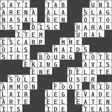 ACROSS 1. Suttee (variant) 5. Bar bill 8. Corn or form start 11. Sports stadium 13. According to 14. Volcanic refuse 15. Rhinal 16. Benjamin's nick name 17. Von Bismarck 18. Fast jet (abbr.) 19. Compact _ 21. Ethiopian city, capital of Harari 22. A distinct part 24. Mountain range 25. Fortification 27. Madame (abbr.) 29. Lubricates 30. Women servants 32. Proofreading order 33. Town 35. Carryall 39. Supplementing with great effort 41. Advice 42. Compass dir. 43. Erase 45. Not divided or shared with others 48. One who uses or employs something 49. ID or VA city 50. 12 inches 52. To free from 55. Den 56. Part of a journey 57. Elude 59. Johnson of "Laugh-In" 60. Snakelike fish 61. Consumed 62. ___ a Wonderful Life 63. Binary compound 64. Afternoon social gatherings DOWN 1. Without 2. Ancient river in northeast Turkey 3. One of the two male reproductive glands 4. _ tizzy (2 wds.) 5. Bar bills 6. Actor Baldwin 7. Bar 8. Extreme 9. Brizilian seaport 10. Composer Stravinsky 12. Tree or shrub in the Birch family 14. Fly high 20. Mischievous child 21. Became colored 23. Clothes sense 25. Greek goddess of the dawn 26. Be seated 27. Third mo. 28. Russian fighter aircraft 30. Large cup 31. Showing deterioration from age 33. Storage container 34. Single 36. Make much ado about nothing 37. Teat (slang) 38. Compass dir. 40. Peachy ____! 43. Superhero pair 44. First name in cosmetics 45. Don Adams' spy role 46. Leaves out 47. Old wives' tales, e.g. 49. Mountain range southwest of Kyrgyzstan 50. Nourish 51. Stare at amorously 53. It may be bright or harebrained 54. Cub Scout units 56. Luau accessory 58. Large container
