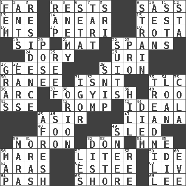 ACROSS 1. Distant 4. Musical pauses 9. Backtalk 13. Compass dir. 14. Approach 15. Trial 16. Mountains (abbr.) 17. _ dish (used to culture cells) 18. Roll call or roster of names 19. Small drink 21. Floor covering 22. Connects, as a bridge 24. Small, narrow, flatbottom fishing boat 26. RI univ. 27. Honkers 29. The Jewish people; Israel 30. Indian princess (variant) 31. Is not 33. Affectionate concern, for short 36. Curve 37. Out of fashion; old fashioned 40. Friend of Pooh 41. Compass dir. 42. Frolic 43. Standard of perfection 45. SW Saudi Arabia district 47. Climbing, woody, usually tropical vines 48. Egg _ yung 49. Downhill vehicle 50. Person of subnormal intelligence 52. Spanish title 54. Madame (abbr.) 56. Female horse 57. 61 cubic inches 59. Binary compound 61. Caspian sea tributary 62. First name in cosmetics 63. 54 in ancient Rome 64. Romantic infatuation 65. Dinah or Pauly 66. Area sheltered from the wind DOWN 1. Opposite of masc. 2. Pismires 3. Dwelling 4. Strike 5. Foe 6. Stalk of a moss capsule 7. Small pie 8. _ Lanka 9. Put through a sieve 10. Period of immesurable duration 11. Fast planes 12. R.R. building 20. Airs 22. Sets or collections 23. Adept person 25. Coral ridge 27. Pate de foie ____ 28. Hearing organs 29. Clip 31. Russian composer Stravinsky 32. Symbol (abbr.) 33. Excercise machine 34. Grant temporary use of 35. Root beer relative 38. Greek mythologigal hunter 39. Land elevation 44. South Vietnam president (1954) 45. Anew 46. "Barney Miller" actor Jack 49. Contemptuous expression 50. Hindu Mythology: god of death 51. Mouths or openings 52. Food container 53. "Beetle Bailey" pooch 55. Singer Brickell 56. Atlas unit 57. French article 58. Portuguese money of account (variant) 60. First lady