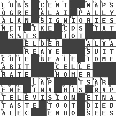 ACROSS 1. Tennis shots 5. Penny 9. Atlas contents 13. Legendary monster 14. Jai _ 15. Chummy 16. ____ Jay Lerner 17. Seigniories (variant) 19. Fish or hair follower 20. D.D.E's nickname 21. Music discs 22. Make lace 23. Fast planes 25. Small child 26. A person who is older than you are 30. Inventor's middle name 34. Break or tear apart 35. Costume for a special activity 36. ____ d'Azur (French Riviera) 39. Memphis, Tenn. Street 42. Heavy book 43. "This won't hurt ____!" 44. Cell (Danish) 46. Pace 47. Baseball hit which scores a run 48. Pet locale 51. Russian ruler of old 54. Compass dir. 57. _ tizzy (2 wds.) 58. Part of HMS, perhaps 60. Hit sharply and swiftly 62. Boob tube 65. Inactive volcano in Sicily 66. Clothes sense 67. A blast of a horn 68. Passed on 69. Actor Baldwin 70. Inside; within (prefix) 71. Observes DOWN 1. Grant temporary use of 2. Stares 3. Naughty children 4. Elected rep. 5. Keg 6. Writer Wiesel 7. Tired old horse 8. Tinged 9. Impair 10. Came down and settled, as after flight 11. Entreaty 12. System (abbr.) 15. Mail 18. Wedding promise 20. Capri or Wight 24. Cylindrical with tapered ends 27. Small moist lump or mass 28. First lady 29. Arrive at 30. Michaelmas daisies 31. Nilotic language 32. Zeal 33. Had dinner 36. 4-wheeled motor vehicle 37. Chief or king in Benin or Nigeria 38. Teat (slang) 40. Lion 41. Shade tree 45. Allows 48. Moving, as bait 49. Cuckoo 50. Thick mixture 52. Nick name for Arthur 53. Indian princess (variant) 54. Singer James 55. Be tempered by heat 56. Otherwise 58. Parka part 59. To the inside or interior of 61. Writing tablets 63. And so on (abbr.) 64. Electrically charged atom 65. Begley and Asner