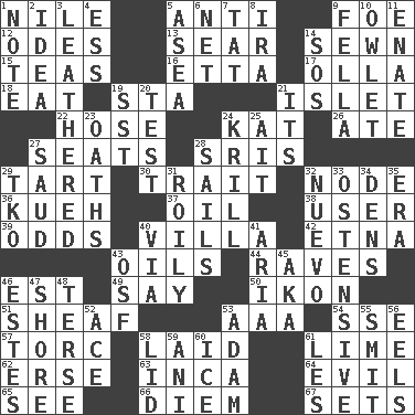 ACROSS 1. The longest river in the world 5. Against 9. Enemy 12. Lyric poems 13. Shrivel 14. Stitched 15. Beverages made from leaves 16. Singer James 17. Rounded earthenware pot or jar 18. Ingest 19. R.R. building 21. Small island 22. Stockings 24. Krazy ___ of comics 26. Had dinner 27. Theater features 28. Indian titles of respect 29. Small pie 30. Distinguishing feature 32. Thickened enlargement 36. Malaysian steamed pastry 37. Lubricate 38. One who uses or employs something 39. Probability 40. Country estate 42. Inactive volcano in Sicily 43. Petroleums 44. All-night dance parties 46. Eastern Standard Time (abbr.) 49. Declare 50. Picture 51. Bundle of cut stalks of grain 53. American Automobile Association (abbr.) 54. Compass dir. 57. Torque (variant) 58. Put down 61. Welles in "The Third Man" 62. Celtic language 63. South American Indian 64. Morally bad or wrong 65. Perceive with the eye 66. South Vietnam president (1954) 67. Puts into a specified state DOWN 1. Short letter 2. The main thing one is thinking about 3. Resembling or made to resemble leather 4. Curvy letter 5. At sea 6. Fish or hair follower 7. Make lace 8. Retirement account (abbr.) 9. Man or boy (slang) 10. A small or young owl 11. Related on the mother's side 14. Mayday 19. Fast jet (abbr.) 20. Trial 21. It is 23. Profane or obscene expressions 24. The principal food of baleen whales 25. Small island 27. Saudi Arabian king (1953-1964) 28. Moves on water 29. Ring climax 31. Agitated, as a liquid 32. New (sp.) 33. Clearly or manifestly demonstrative 34. Cub Scout units 35. Period 40. By way of 41. Operatic vocal solo 43. Order of Saint Francis (abbr.) 45. Alias (abbr.) 46. _____ Park, CO 47. Dinah or Pauly 48. Laconic 52. Adept person 53. First man 55. Stricken, poetically 56. Snakelike fish 58. Hat (slang) 59. Black tropical American cuckoo 60. Frozen water 61. French article