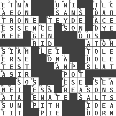 ACROSS 1. Inactive volcano in Sicily 5. University (slang) 8. Affectionate concern, for short 11. Age 12. Without 14. Boat paddle 15. Marketplace scale 17. Miss Universe 1986, Barbara Palacios _ 18. Adept person 19. Core 21. Male child 22. Color 23. Born 24. Commissioned military rank (abbr.) 25. Two (Sp.) 27. To free from 28. Smallest unit of an element 31. Thailand, formerly 35. Luau accessory 37. Lacquered or enameled metalware 38. Celtic language 39. Heredity factor (abbr.) 41. Opening into or through something 42. Trial 43. Electrical Unit 45. Narrow board 46. SW Saudi Arabia district 47. Cooking vessel 49. Distress signal 51. Compass dir. 52. Ocean 55. Fish or hair follower 57. Double-curved letter 60. Thinks logically 62. "One Day ___ Time" 63. Maternal 65. Table seasonings 66. Player for Phoenix 67. Essential or central part 68. The main thing one is thinking about 69. Teat (slang) 70. Sliced dessert 71. Dormintory (informal) DOWN 1. Eroded 2. Laconic 3. Trap for birds or small mammals 4. Singer Murray 5. Purpose 6. Negative votes 7. _ china 8. Inedible or poisonous agaric 9. Made of lace 10. Algonquian 13. Post 16. Engineer (abbr.) 17. Looked after 20. To provide with a ceiling 26. Profane or obscene expressions 29. Water jar 30. Confront 31. Stalk of a moss capsule 32. Angers 33. Aide 34. Paris' subway 36. _ tizzy (2 wds.) 40. Electrical Unit 44. Introduce or present, as a question 48. Beverages made from leaves 50. Ooze 52. Twentieth part of a lira 53. Keyboard key 54. Indian state 55. Political cartoonist Thomas 56. Needle holder 58. Clip 59. Suttee (variant) 61. Expressed in words 64. Definite Article