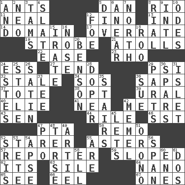 ACROSS 1. Pismires 5. Daniel's nick name 8. _ de Janeiro 11. Be tempered by heat 12. Fine (Spanish) 13. Indiana (abbr.) 14. Realm 17. Make much ado about nothing 19. Disco prop 21. Ringlike coral islands and reefs 22. Comfort 23. 17th letter of the Greek alphabet 24. Double-curved letter 27. Look after 29. Air pressure measure (abbr.) 32. Lacking originality or spontaneity 34. Distress signal 36. Plant excrements 37. Haul 38. Elect 39. Mountain range 40. Writer Wiesel 41. Teachers' org. 42. Distance measurement (Brit.) 43. Elected rep. 44. Cause heat under the collar 46. Fast jet (abbr.) 47. Parent Teacher Association (abbr.) 50. San ____ (Riviera town) 52. A viewer who gazes fixedly 55. Michaelmas daisies 57. News announcer 59. Had an oblique or slanted direction 62. ___ a Wonderful Life 63. Filth; sediment 64. Billionth: prefix 65. Observe 66. Snakelike fish 67. Singles DOWN 1. Added to 2. Modern: prefix 3. Scottish caps 4. Chalkboard 5. HTML Container Element 6. Approach 7. _ pole 8. Monetary unit of Yemen 9. International (abbr.) 10. Lyric poems 12. Enemy 15. Feeling or showing extreme anger 16. Sense of smell 18. Friend of Pooh 20. Gillaume's butler role 24. _____ Park, CO 25. Fur scarf 26. Smooth fabric 28. Drug addict 29. Components 30. Practice fights 31. Small island 33. Area sheltered from the wind 35. Flight of steps 36. Take to court 42. Klaipeda city 45. Allows 47. Adept person 48. Laconic 49. Nick name for Arthur 51. U. of Maine site 52. Indian titles of respect 53. False hair 54. Domed church section 55. "We ___ not amused" (Victoria) 56. Connect, as a bridge 58. Pipe bend 60. Compass dir. 61. Two (Sp.)