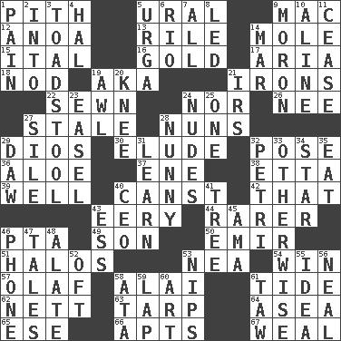 ACROSS 1. Heart or essence 5. Mountain range 9. Big _ 12. Small Philippine buffalo 13. Cause heat under the collar 14. Undercover agent 15. Slanted text style (abbr.) 16. Gilt 17. Operatic vocal solo 18. Lower and raise head in agreement 19. Alias (abbr.) 21. Removes the wrinkles 22. Stitched 24. And not 26. Born 27. Showing deterioration from age 28. Religious women 29. "Vaya con ____" 30. Dodge 32. Introduce or present, as a question 36. Medicinal plant 37. Compass dir. 38. Singer James 39. Water source 40. 2nd pers. sing. pres. of can (arch.) 42. Not this but _ 43. Suggestive of the supernatural 44. More uncommon 46. Parent Teacher Assoc. 49. Manchild 50. Independent ruler or chieftain 51. Radiant circles of light 53. Teachers' org. 54. Acquire through effort 57. Norwegian king 58. Jai _ 61. Event that recurs at intervals 62. Remaining after all deductions 63. Canvas cover 64. Toward the sea 65. Compass dir. 66. Tenement units (abbr.) 67. Welt DOWN 1. Ache 2. To the inside or interior of 3. Inedible or poisonous agaric 4. Actor Linden 5. Capital and largest city of Mongolia 6. _ de Janeiro 7. 100% 8. Directed 9. Person of subnormal intelligence 10. Place in a line 11. Stop 14. Spoil 19. Leather borer 20. Leg joint 21. Big collection agency 23. Artist's stand 24. Unclothed pictures 25. Single 27. Filth; sediment 28. Pet term 29. Obsolete 31. Memorize 32. _ dish (used to culture cells) 33. Else 34. Play the lead 35. Ingest 40. Corporate head (abbr.) 41. Woody plant 43. Double-curved letter 45. Wet nurse (var.) 46. Give a jingle 47. Stories 48. Having winglike extensions 52. Often (poetically) 53. Cuts off 55. The content of cognition 56. Be tempered by heat 58. _ moment's notice (2 wds.) 59. Infant locale 60. Tate display 61. The 23rd letter of the Hebrew alphabet