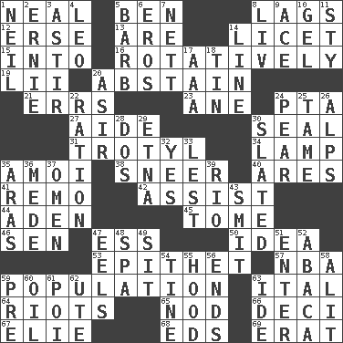 ACROSS 1. Actress Patricia 5. Benjamin's nick name 8. Fails to keep up a pace 12. Celtic language 13. "We ___ not amused" (Victoria) 14. It is permitted: Lat. 15. To the inside or interior of 16. Happening in regular succession 19. Cards in a Roman deck? 20. Refrain by choice 21. Blunders 23. One (Scot) 24. Parent Teacher Assoc. 27. Assistant 30. Lick closed 31. TNT 34. Desk light 35. Mine, in Marseilles 38. Contemptuous expression 40. Ancient Greek god of war 41. San ____ (Riviera town) 42. Aid 44. Arabian gulf 45. Heavy book 46. Elected rep. 47. Double-curved letter 50. The main thing one is thinking about 53. Curse 57. Basketball assoc. 59. Census information 63. Slanted text style (abbr.) 64. Disturbances 65. Allow head to fall sleepily 66. Tenth: prefix 67. Writer Wiesel 68. Begley and Asner 69. Part of Q.E.F. DOWN 1. Famous astronaut Armstrong 2. Bert's buddy 3. Having gotten out of bed 4. Lion 5. Sharp remark 6. Greek god of love 7. Remaining after all deductions 8. 54 in ancient Rome 9. Adept person 10. Set 11. Filthy place 14. Actor's bit 17. American Automobile Association (abbr.) 18. Shallow baking pan 20. SW Saudi Arabia district 22. Food allowance for one day 24. Lightbulb-shaped fruit 25. Docile 26. High mountains 28. Two (Sp.) 29. Inactive volcano in Sicily 30. Scheduled 32. Affirmative reply 33. For fear that 35. Caspian sea tributary 36. Ancient Persian 37. Presage 39. _ de Janeiro 43. Stricken, poetically 47. Snakelike fish 48. Health resort 49. Be seated 51. Keyboard key 52. Phillipine bananalike plant 54. Prong on a fork 55. Parka part 56. Extremities 58. Came down and settled, as after flight 59. Before (prefix) 60. Lubricate 61. Luau course 62. Shoshoni 63. Binary compound