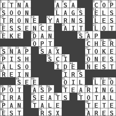 ACROSS 1. Inactive volcano in Sicily 5. White ___ sheet 8. Police officer (slang) 11. Within a short period 12. Fails to keep up a pace 14. Raised railways 15. Heavy duty weighing machine 17. Entertaining tales 18. French article 19. Center 21. Small island 22. Car dealer's back yard 23. Make supply last 24. Daniel's nick name 25. Plant excrement 27. Elect 28. "Mermaids" star 31. Fastener 35. Saxophone 37. Casino tip 38. Expression of disdain 39. _-fi 41. Singles 42. In addition 43. Binary compound 45. Egg locale 46. It's straight from the horse's mouth 47. Big collection agency 49. Observe 51. Lubricate 52. Lion 55. Plant holder 57. Viper 60. Rending 62. Lyricist Gershwin 63. Theater features 65. "_____ Recall" 66. Baking dish 67. Falsehood 68. False hair 69. Eastern Standard Time (abbr.) 70. Acura sports coupe 71. Ancient Greek god of war DOWN 1. First name in cosmetics 2. Cod relative 3. Trap for birds or small mammals 4. Queen of England 1702-14 5. In the manner of 6. "Two Mules for Sister ____" 7. Hindu god of fire 8. Portable communications device 9. Margarine 10. Inconspicuous attention getter 13. Fast planes 16. Inside; within (prefix) 17. Gossips 20. Smile enhancers 26. Gambison 29. Makes supply last 30. Take ten 31. Coast Guard woman 32. The longest river in the world 33. Helper 34. Give a jingle 36. One more than ninety 40. Foolish or stupid persons 44. 4th largest of the Great Lakes 48. Narrow board 50. Compass direction 52. 61 cubic inches 53. Maternal 54. Stares at amorously 55. Corncob 56. Mouths or openings 58. Wither 59. Friends 61. Roll call or roster of names 64. John Ritter's dad