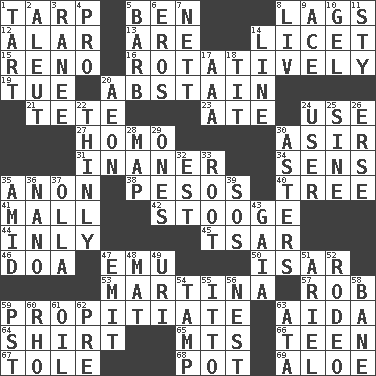 ACROSS 1. Canvas cover 5. Benjamin's nick name 8. Fails to keep up a pace 12. Having or resembling wings 13. "We ___ not amused" (Victoria) 14. It is permitted: Lat. 15. Western Nevada city 16. Rotating or pertaining to rotation 19. Third day of the wk. 20. Choose not to consume 21. False hair 23. Had dinner 24. Purpose 27. Like (prefix) 30. SW Saudi Arabia district 31. More lacking in sense or substance 34. Elected reps. 35. At once, immediately (arch.) 38. Mexican monetary units 40. Relationship diagram 41. Shopping center 42. Moe Howard, for one 44. In an inward manner 45. Russian ruler of old 46. ___ good deed 47. Australian flightless bird 50. Austrian river, tributary to the Danube 53. Chrissie's court nemesis 57. Director Reiner 59. Conciliate 63. Opera by Verdi 64. Upper-body garment 65. Mountains (abbr.) 66. Adolescent 67. Lacquered or enameled metalware 68. Cooking vessel 69. _ vera DOWN 1. Small pie 2. Native American of Southwest Alaska 3. The wife of a rajah (variant) 4. Adept person 5. Sharp remark 6. Greek god of love 7. Remaining after all deductions 8. 54 in ancient Rome 9. Adept person 10. Set 11. Filthy place 14. Actor's bit 17. Auto club (abbr.) 18. Teat (slang) 20. A really long time 22. Without force or sincere effort 24. One who makes use of a thing 25. Trig term 26. Celtic language 28. Atlas unit 29. Washington bills 30. Michaelmas daisies 32. Eastern Standard Time (abbr.) 33. Carrot, for example 35. Among 36. Billionth: prefix 37. Spanish pot 39. Mayday 43. Greek goddess of the earth (variant) 47. Send forth 48. Floor covering 49. RI univ. 51. Satellite of Uranus 52. Cowboy competition 54. Pack (down) 55. "Tell ____ the Marines!" 56. A home for chicks 58. Object of repulsion 59. Pacific Standard Time (abbr.) 60. 17th letter of the Greek alphabet 61. Lubricate 62. Before (prefix) 63. "One Day ___ Time"