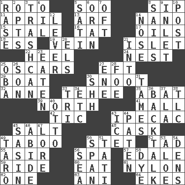 ACROSS 1. Printing process, for short 5. "Barney Miller" actor Jack 8. Small drink 11. Showery time 13. Sandy's bark 14. Billionth: prefix 15. Showing deterioration from age 16. Make lace 17. Lubricates 18. Double-curved letter 19. Distinctive style or manner 21. Small island 22. The bottom of a shoe or boot 24. Egg locale 25. Motion picture awards 27. Bank Draft (abbr.) 29. Water vessel 30. Snout, nose 32. Queen of England 1702-14 33. Giggle 35. Blind as ____ 39. _ pole 41. Shopping center 42. Nervous spasm 43. Medicinal drug used to evoke vomiting 45. Table seasoning 48. Keg 49. Off limits 50. Proofreading order 52. Small boy 55. SW Saudi Arabia district 56. Health resort 57. Peak District village in England 59. Travel on an animal 60. Consume 61. Thermoplastic polyamide 62. Single 63. Black tropical American cuckoo 64. Supplements with great effort DOWN 1. Raze (variant) 2. Chooses 3. File 13 4. Lubricate 5. Suttee (variant) 6. Northwest Algerian city 7. Often (poetically) 8. Moves on water 9. An arm off of a larger body of water 10. Mail 12. Prying instrument 14. Olfactory organ 20. Raised railways 21. To the inside or interior of 23. Consumed 25. Chief or king in Benin or Nigeria 26. Boy, to dad 27. Compass dir. 28. Enemy 30. Quiet! 31. Makes less strong or intense 33. Three (prefix) 34. And so on (abbr.) 36. Sass 37. Insect wing 38. Affectionate concern, for short 40. "Beetle Bailey" pooch 43. Frozen water 44. Eucharist need 45. Indian antelope 46. Tolerate 47. Old wives' tales, e.g. 49. Pacific island yam 50. Connect, as a bridge 51. Jacques of French films 53. Medicinal plant 54. Habitations of wild animals 56. Ocean 58. Color