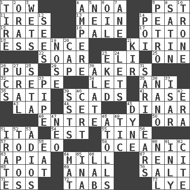 ACROSS 1. Pull behind 4. Small Philippine buffalo 8. Pacific Standard Time (abbr.) 11. Angers 13. Chow _ 14. Lightbulb-shaped fruit 15. Assign a rank or rating to 16. Diluted with white 17. "Beetle Bailey" pooch 18. Gist 21. Japanese brewing company 22. Fly high 23. Connecticut Ivy Leaguer 25. Single 26. Fluid product of inflammation 29. Orators 32. Streamer paper 34. Allow 35. Black tropical American cuckoo 38. Suttee (variant) 39. Large numbers or amounts 41. To erase 43. Pet locale 44. Arrange properly for use 45. Middle Eastern gold or silver currency 46. Plea 50. Mouth or opening 51. Call ___ day 54. Eastern Standard Time (abbr.) 55. Prong on a fork 57. Cowboy competition 59. Pertaining to the sea 63. Capital of Western Samoa 64. Place where flour is made 67. Painter Guido (1575-1642) 68. A blast of a horn 69. Of or related to the anus 70. Table seasoning 71. Curvy letter 72. Bar bills 73. Sodium hydroxide DOWN 1. Hoop that covers a wheel 2. Mouths or openings 3. Moistens 4. Electrical Unit 5. Teachers' org. 6. Lubricate 7. A saturated hydrocarbon 8. Stone: prefix 9. Smooth fabric 10. Heavy duty weighing machine 12. Observes 14. Luau course 19. Olfactory organ 20. Head covering 21. Apertif with cassis 23. Made supply last 24. Allows 26. Personal Computers (abbr.) 27. Mountain range 28. Bristle 30. Having winglike extensions 31. Indian skirt 33. Corncob 36. Billionth: prefix 37. Austrian river, tributary to the Danube 39. Fast planes 40. Foregone conclusion 42. Period 45. Unit of force 47. Modern: prefix 48. Ringlike coral islands and reefs 49. Nervous spasm 51. Feeling or showing extreme anger 52. Traditional theme or motif 53. Goodbye (Sp.) 56. Hearing organs 58. Ingest 60. Anneal 61. Inwardly 62. Quote 64. Floor covering 65. _ tizzy (2 wds.) 66. Experiment locale